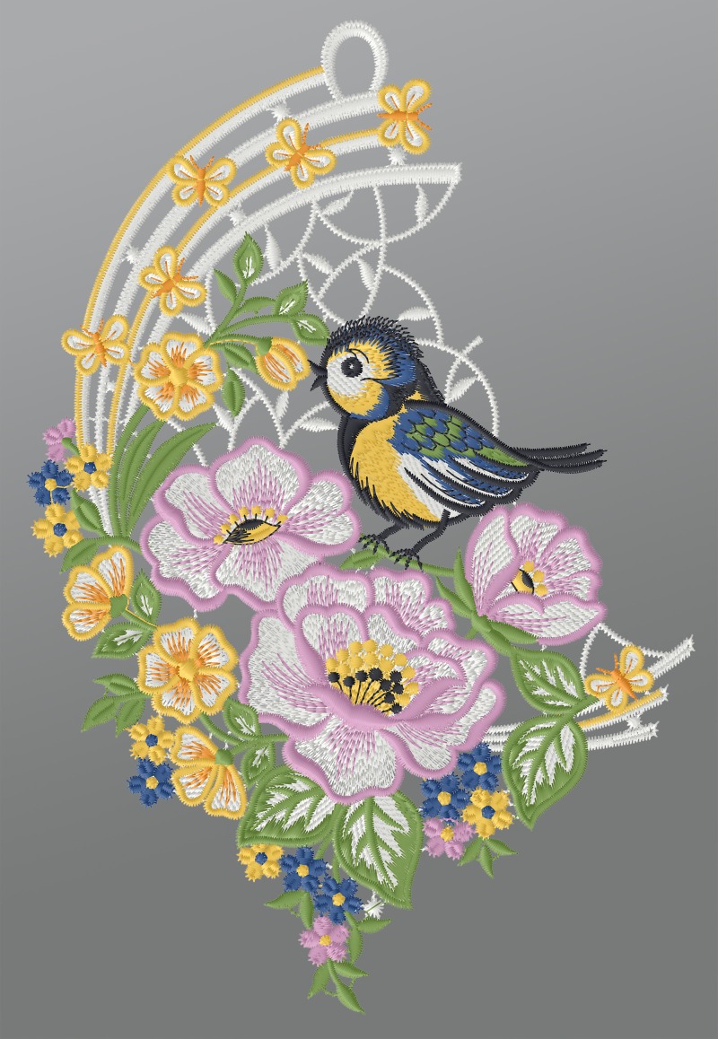 In diesem Fensterbild von Plauener Spitze® ist eine entzückende Blaumeise zu sehen, die auf einem Blumenarrangement ruht. Die fliessenden Formen verleihen dem Raum Dynamik und Lebhaftigkeit. Die Vielfalt der Blumen stellt die Schönheit der Natur dar, die den kleinen Vogel zu begeistern scheint. Die rosafarbenen Blüten, die an Hibiskus erinnern, stechen besonders hervor und verleihen dem Fensterbild ein frisches, frühlingshaftes Flair. Das ansprechende Design zeichnet sich durch weisse Elemente und auffällige gelbe Blumen aus, die entlang des gesamten Bogens angeordnet sind und eine spielerische Note vermitteln.