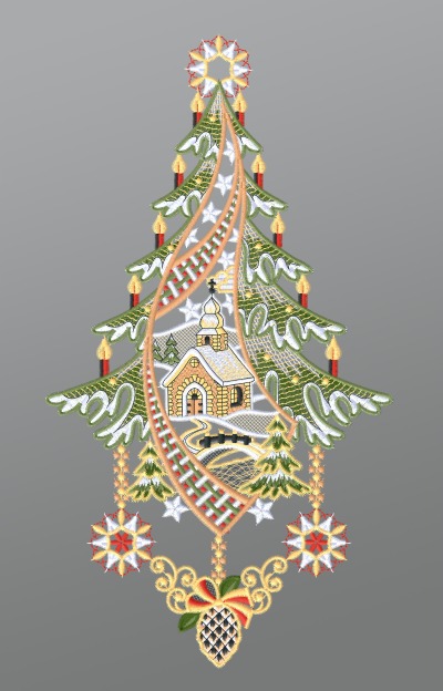 30,35 CHFFensterbild aus Plauener Spitze® - Kirche mit Tannenbaum und Glocken #1W mehrfarbig