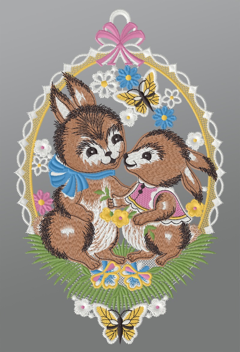 Fensterbild aus Plauener Spitze® - Hasenpaar #1W mehrfarbig
