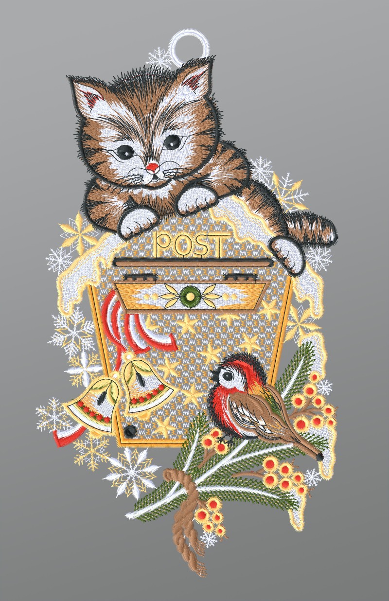 Fensterbild aus Plauener Spitze® - Kätzchen mit Vogel und Briefkasten #1W mehrfarbig