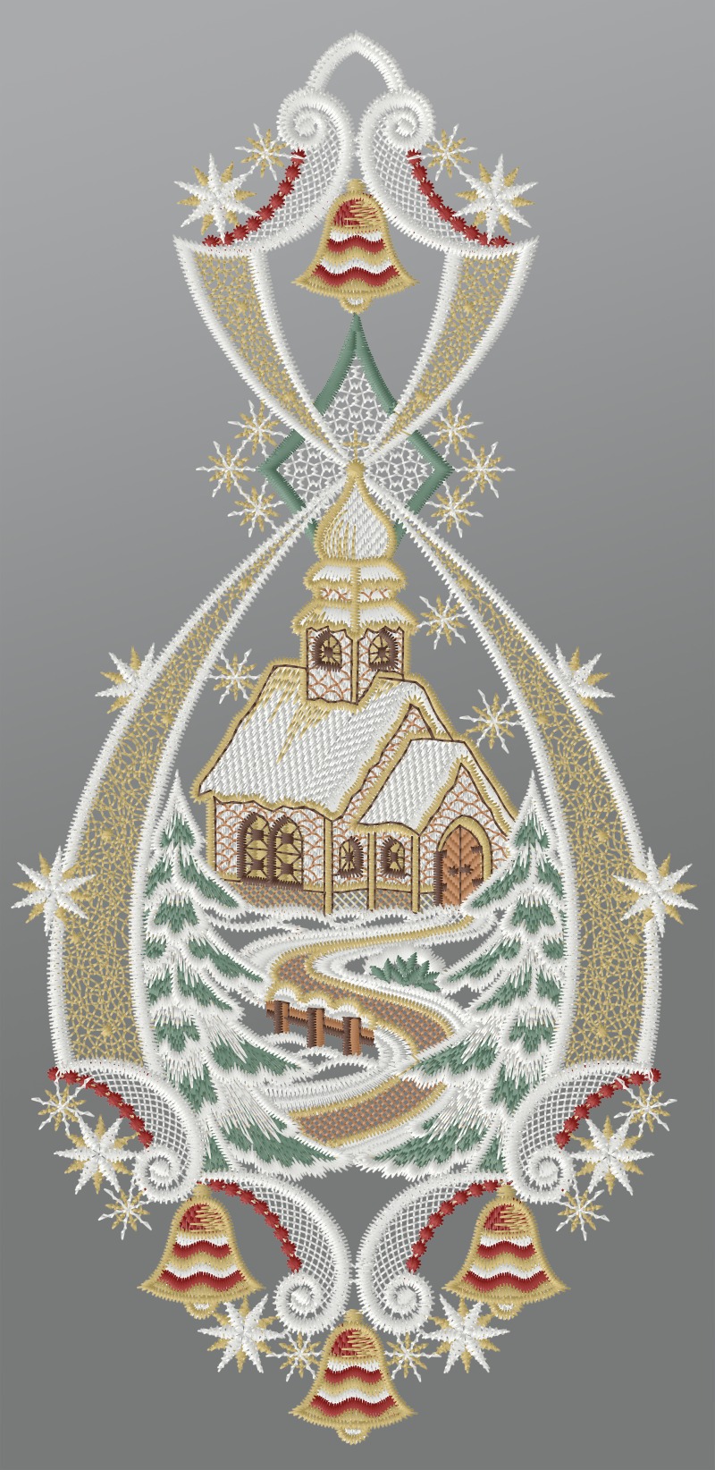 26,75 CHFFensterbild aus Plauener Spitze® - Weihnachtsglocken mit Schneeflocken #1W mehrfarbig