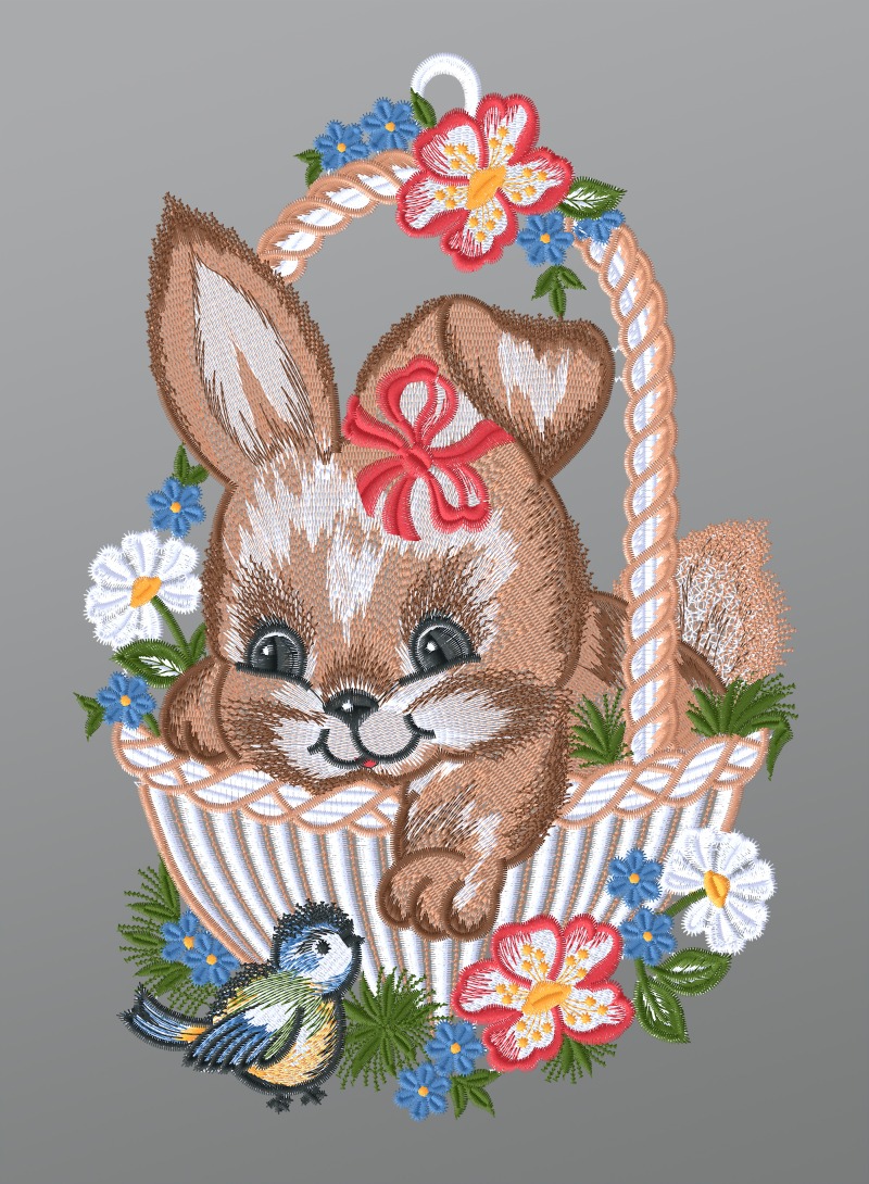 Fensterbild aus Plauener Spitze® - Kleine Häsin in Osterkörbchen #1W mehrfarbig