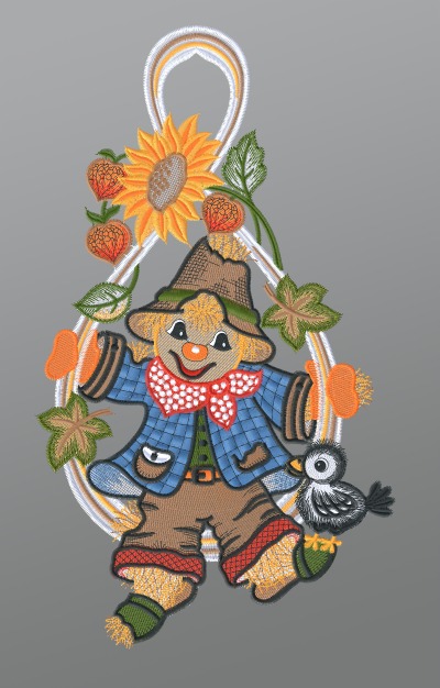 35,95 CHFFensterbild aus Plauener Spitze® - Vogelscheuche mit Herbstlaub und Vögelchen #1W mehrfarbig