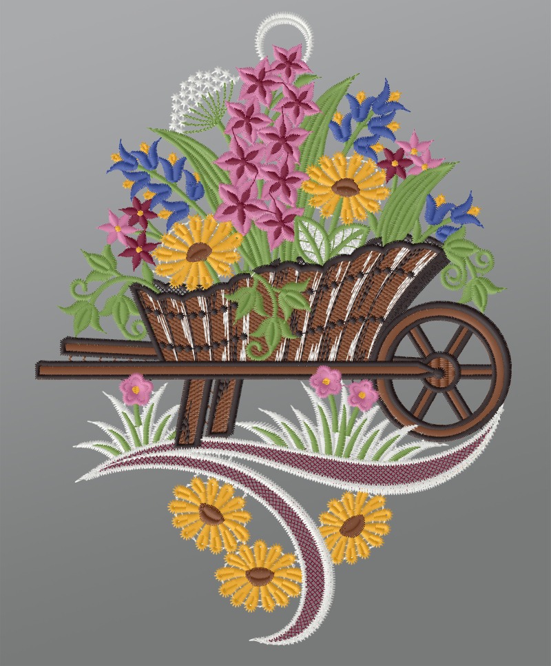 Fensterbild aus Plauener Spitze® - Schubkarre mit Blumen #1W mehrfarbig