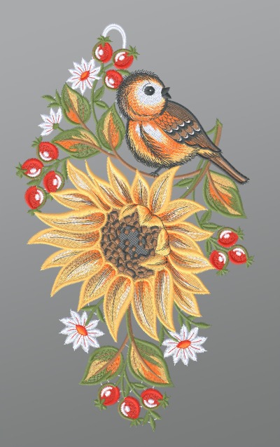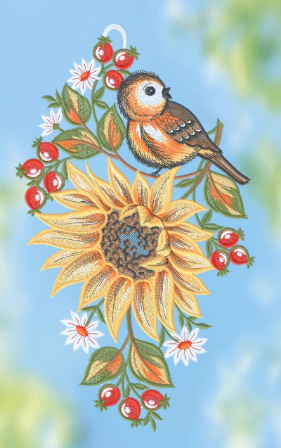 Fensterbild aus Plauener Spitze® - Sonnenblume mit Vögelchen #1W mehrfarbig