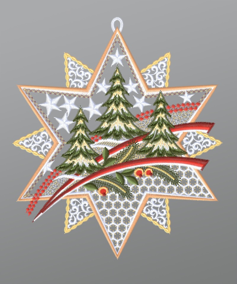 Fensterbild aus Plauener Spitze® - Tannenbäume mit Sternen #1W mehrfarbig