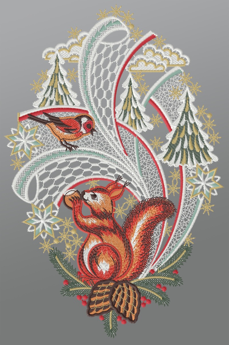 Das Fensterbild von Plauener Spitze® zeichnet sich durch seine ovale Form aus, die mit unterschiedlich geschwungenen, teils netzartigen, teils fein verflochtenen Mustern verziert ist. Die lebendigen Konturen in Rot und Mint kontrastieren auffällig mit dem überwiegend in Weiss, Gold und Grün gehaltenen Design. Sie spiegeln die Farbtöne des Rotkehlchens und des Eichhörnchens wider, welche die zentralen Elemente des Bildes sind. Das Eichhörnchen, das eine Haselnuss in seinen Pfoten hält, scheint in eine Art Gespräch mit dem höher sitzenden Rotkehlchen vertieft. Die Szene wird oben von dichten Wolken umgeben, aus denen Schnee auf die Welt und auf die Tannen herabfällt, die zusammen mit kunstvollen Sternenformen über das Bild verteilt sind. Den unteren Rand des Fensterbildes schmückt ein ansprechendes Arrangement aus einem grossen Zapfen und Tannenzweigen.
