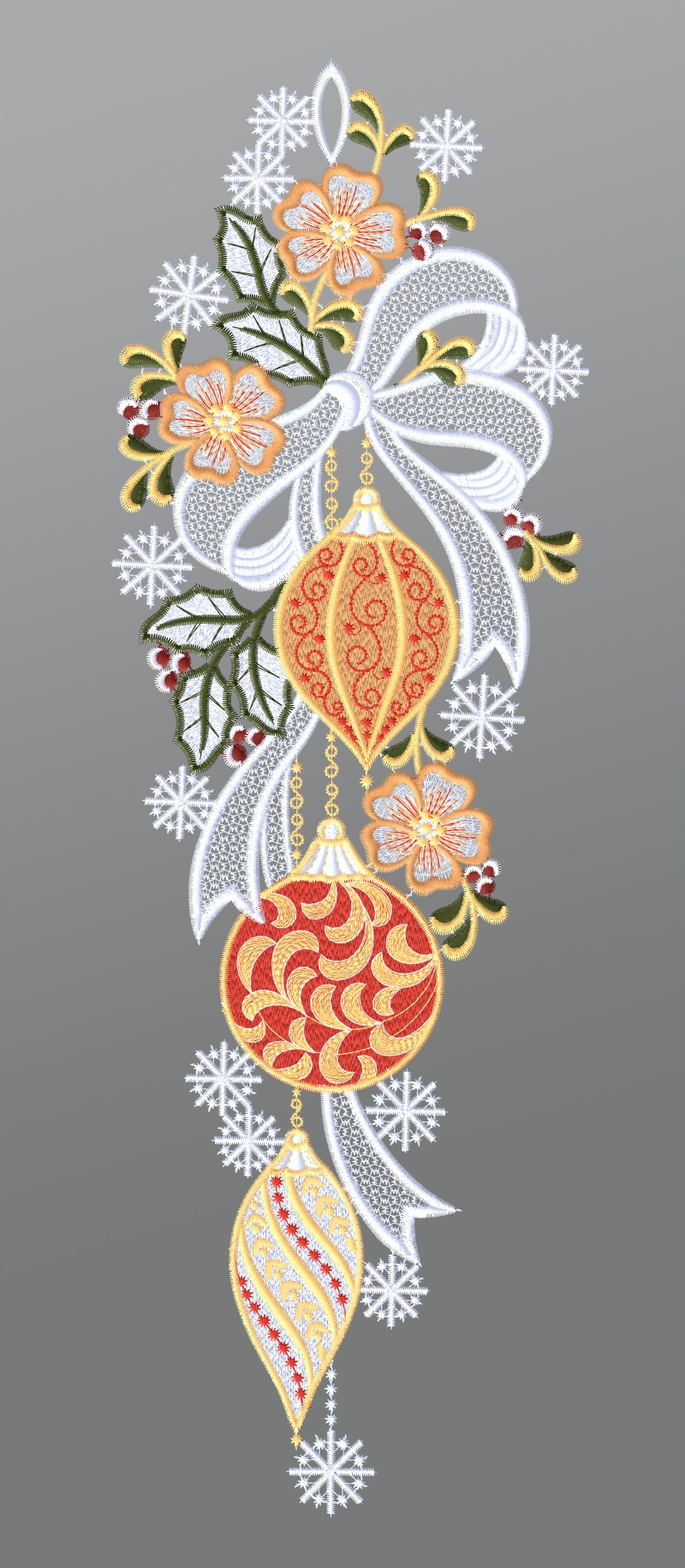 Das Fensterbild aus Plauener Spitze® zeigt ein schmuckvolles Arrangement aus Baumbehang, Mistelzweigen, Schleifen und Schneeflocken. Die Glaskugeln sind mit Mustern oder Ornamenten verziert und bunt gestaltet. Das Fensterbild ist durch seine aussergewöhnliche Form und die Vielfalt an Farben, Mustern und Strukturen ein Hingucker. Es verleiht dem Interieur einen festlichen Charakter und setzt die Glasfront zur Weihnachtszeit geschmackvoll in Szene.