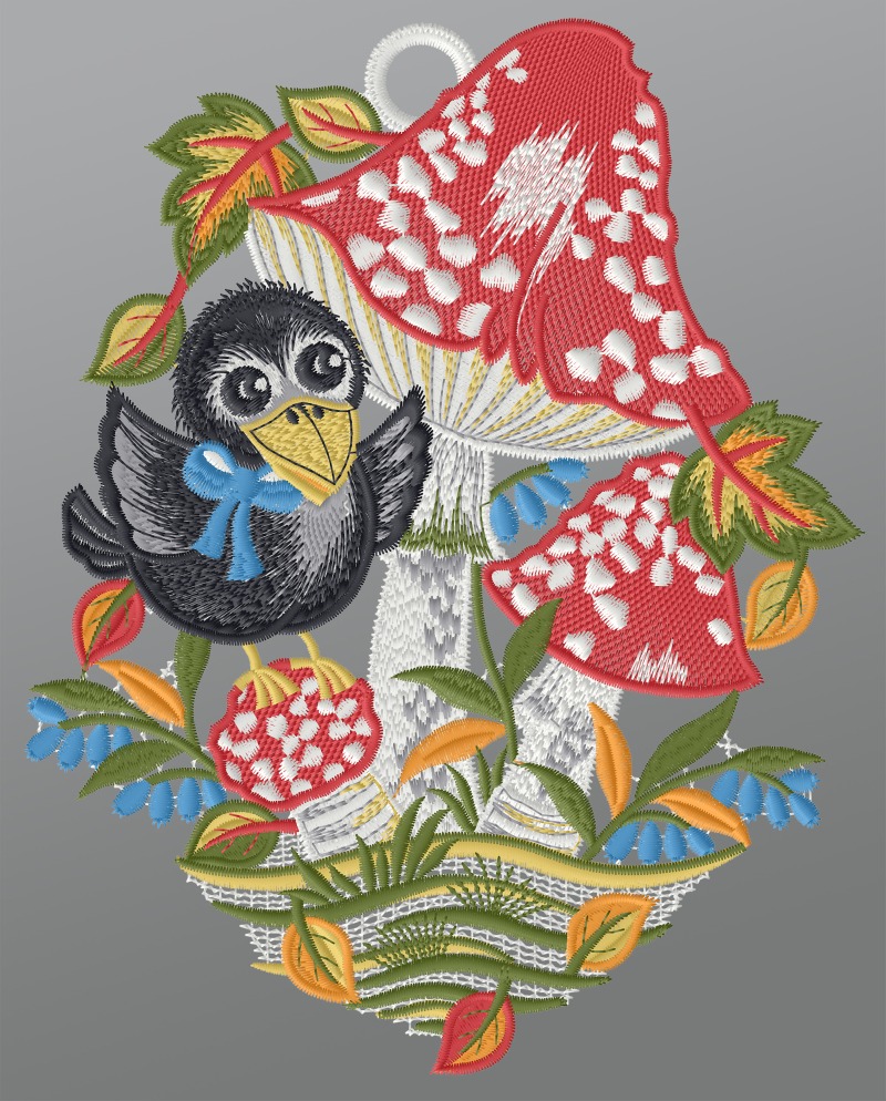 Fensterbild aus Plauener Spitze® - kleiner Rabe unterm Fliegenpilz #1W mehrfarbig