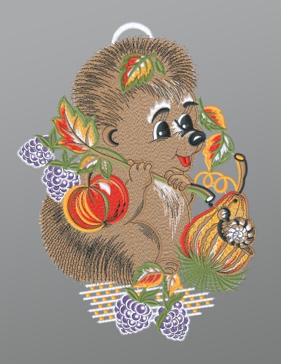 24,25 CHFFensterbild aus Plauener Spitze® - Igel mit Brombeeren und Schnecke #1W mehrfarbig
