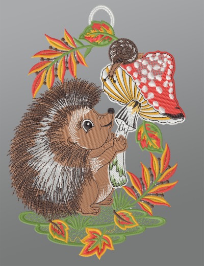 33,15 CHFFensterbild aus Plauener Spitze® - Igel mit Fliegenpilz #1W mehrfarbig