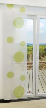 Elegant und doch verspielt: Diese Schiebegardine ist mit verschieden grossen Kreisen verziert, die so wirken, als würden sie wie Bälle von oben herabfallen. Im Hintergrund bewegen sich weisse Kreise, die die bunten Kreise mit Streifenstruktur noch ergänzen. Dennoch schieben sich die bunten Kreise stets vor die weissen Formen und bleiben Mittelpunkt des Designs. Das grösstenteils transparente Polyestergewebe lässt viel mildes Licht hindurch und den Raum freundlich und hell wirken. Mit Klettband lässt sich der Behang gleich an einer Flexoschiene anbringen. Beides ist im Lieferumfang bereits enthalten. Mit der Bestellung dieser Schiebegardine bekommen Sie ebenfalls das Montagematerial, passende Tellergleiter und den Beschwerungsstab in drei Teilen geliefert. Auf Wunsch kürzen wir den Stoff auf ein passendes, individuelles Mass und bringen oben einen Tunnelzug an. Damit können Sie diese Schiebegardine auch einfach auf eine Gardinenstange aufziehen.