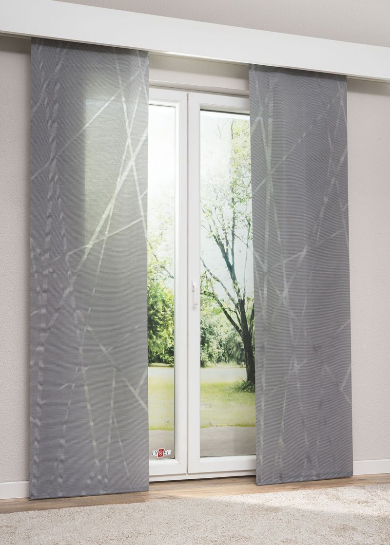 Das grafisch und geometrisch inspirierte Motiv kommt durch die Gestaltung in Grau-Weiss besonders gut heraus. Es bleibt dem monochromen Stil treu und spielt mit verschiedenen Schattierungen von Grau, die sich, ergänzt durch schwarze Linien, harmonisch von dem weissen Stoff der Schiebegardine abheben. In ein geradliniges und modernes Interieur passt dieses Modell besonders gut, verträgt aber genauso kräftige Farben, die daneben noch besser zur Geltung kommen.
