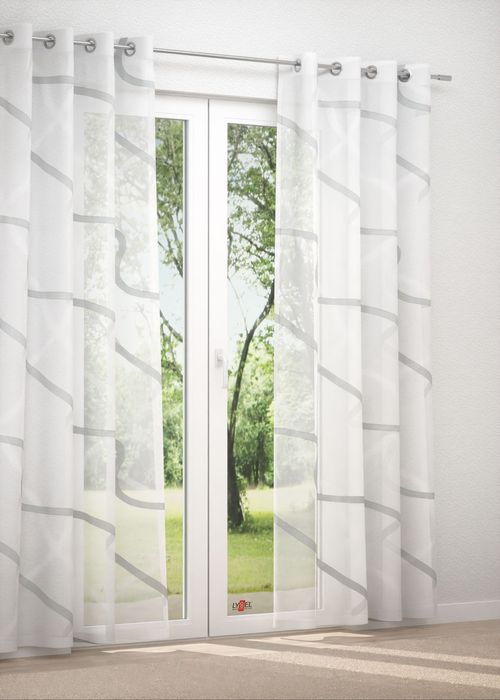 Ein zarter Nebelschleier im November, ein Vorhang im Wind. Gemächlich, besonnen und ruhig wirkt die weisse Schiebegardine mit dem in Grau gestalteten Motiv. Sie fügt sich besonders gut in moderne, geradlinige Umgebungen ein, lässt sich mit Accessoires aus Glas, schwarzem Metall und verwandten Abstufungen von Grau toll in Szene setzen.