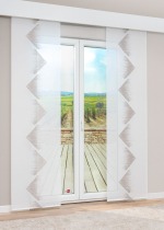 Bei diesem Vorhang steht neben seiner eleganten Erscheinung vor allem das kreativ gestaltete geometrische Muster im Blickpunkt: Dreiecke, die jeweils in entgegengesetzte Richtungen weisen und eine fast ausgefranste Basisseite haben, harmonieren perfekt mit dem Stoffhintergrund und betonen die moderne Ausstrahlung des Vorhangs. Die Transparenz des nach Oekotex Standard 100 zertifizierten Polyestergewebes ist ein weiterer dekorativer sowie praktischer Aspekt. Sie ermöglicht, dass Räume lange mit Tageshelligkeit verwöhnt werden, während blendende Sonnenstrahlen abgemildert werden und eine sanftere Wirkung entfalten. Dadurch passt der Schiebevorhang auch ideal in Umgebungen, die aufgrund ihrer Lage normalerweise nur wenig Tageslicht erhalten. Zur Befestigung an der Schiene wird das im Lieferumfang enthaltene Klettband verwendet. Den Paneelwagen sowie einen Beschwerungsstab bekommen Sie ebenfalls bei Bestellung. Für die Reinigung verwenden Sie einfach den Schonwaschgang in der Maschine. Wenn Sie den Vorhang kürzen möchten, steht Ihnen unser Konfektionsservice gern zur Verfügung.