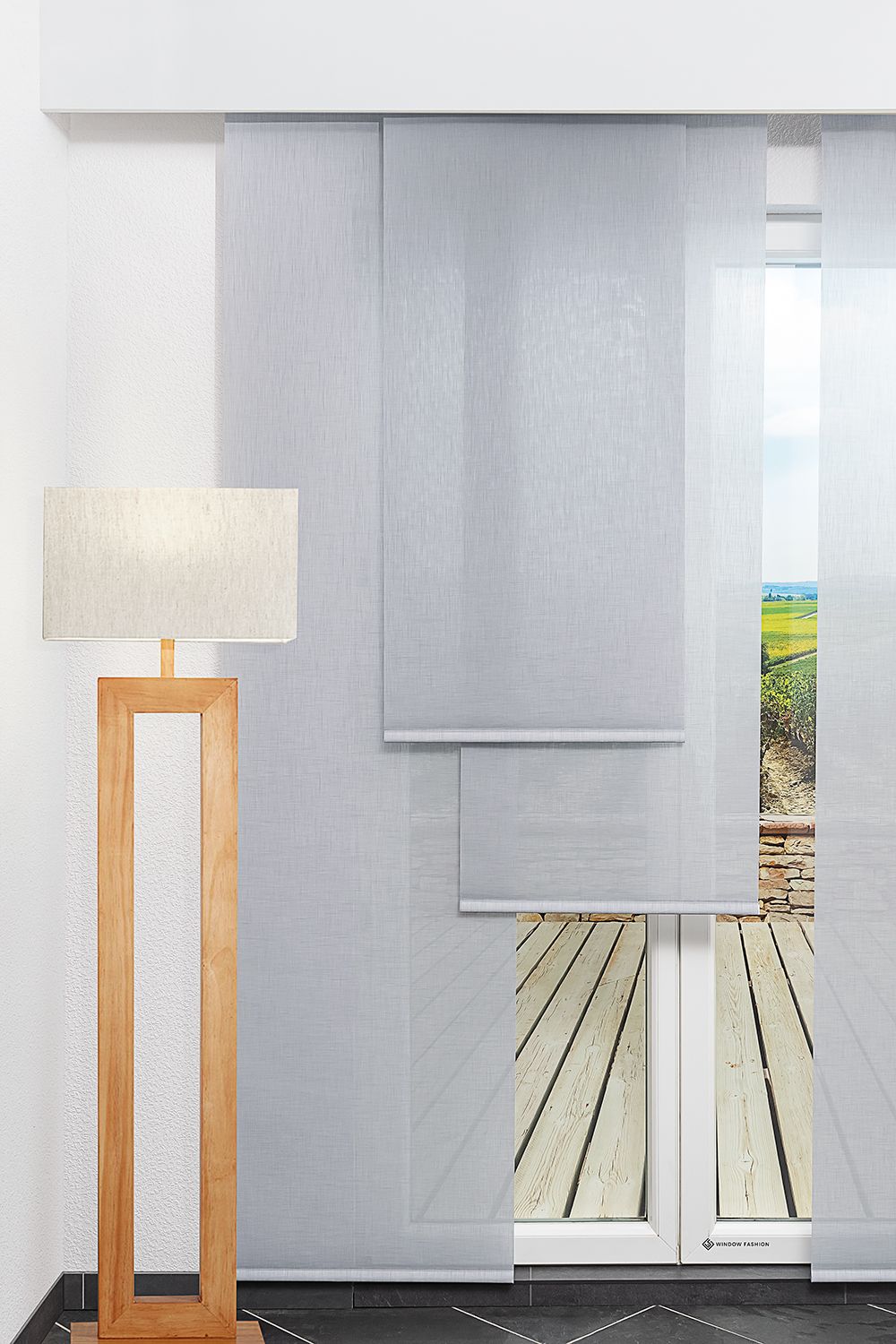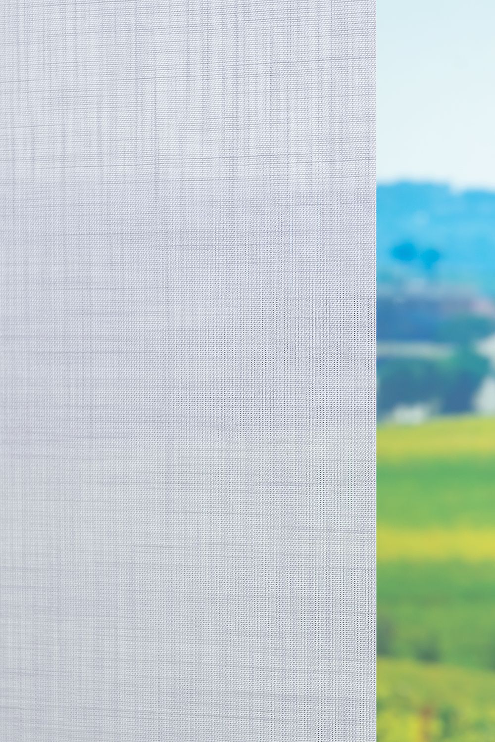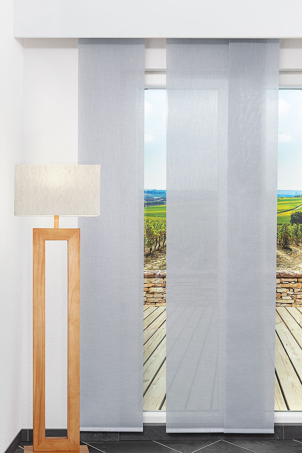 Dieser Flächenvorhang legt einen zarten Schleier vor Ihre Fenster, der Tageslicht nur leicht gefiltert in den Raum einlässt. Gegenlicht bringt dabei erst die grobe, an Leinen erinnernde Gewebestruktur der Schiebegardine zum Vorschein. Die Kombination dieser dekorativen Eigenschaften wirkt besonders hochwertig und kann sich in vielen Einrichtungsstilen entfalten. Der zarte Stoff hat dennoch einige Funktionen wie die Eignung für Feuchträume und Waschbarkeit per Hand bis 30 Grad vorzuweisen. Steingrau sorgt an Ihrem Lieblingsplatz optisch für Ruhe und Gemütlichkeit. Hinzu kommt noch eine äusserst warme Ausstrahlung. Der Behang harmoniert sowohl mit strahlendem Weiss als auch mit Naturmaterialen wie Holz. Da dürfen andere Farben als Akzent ruhig etwas lauter sein.