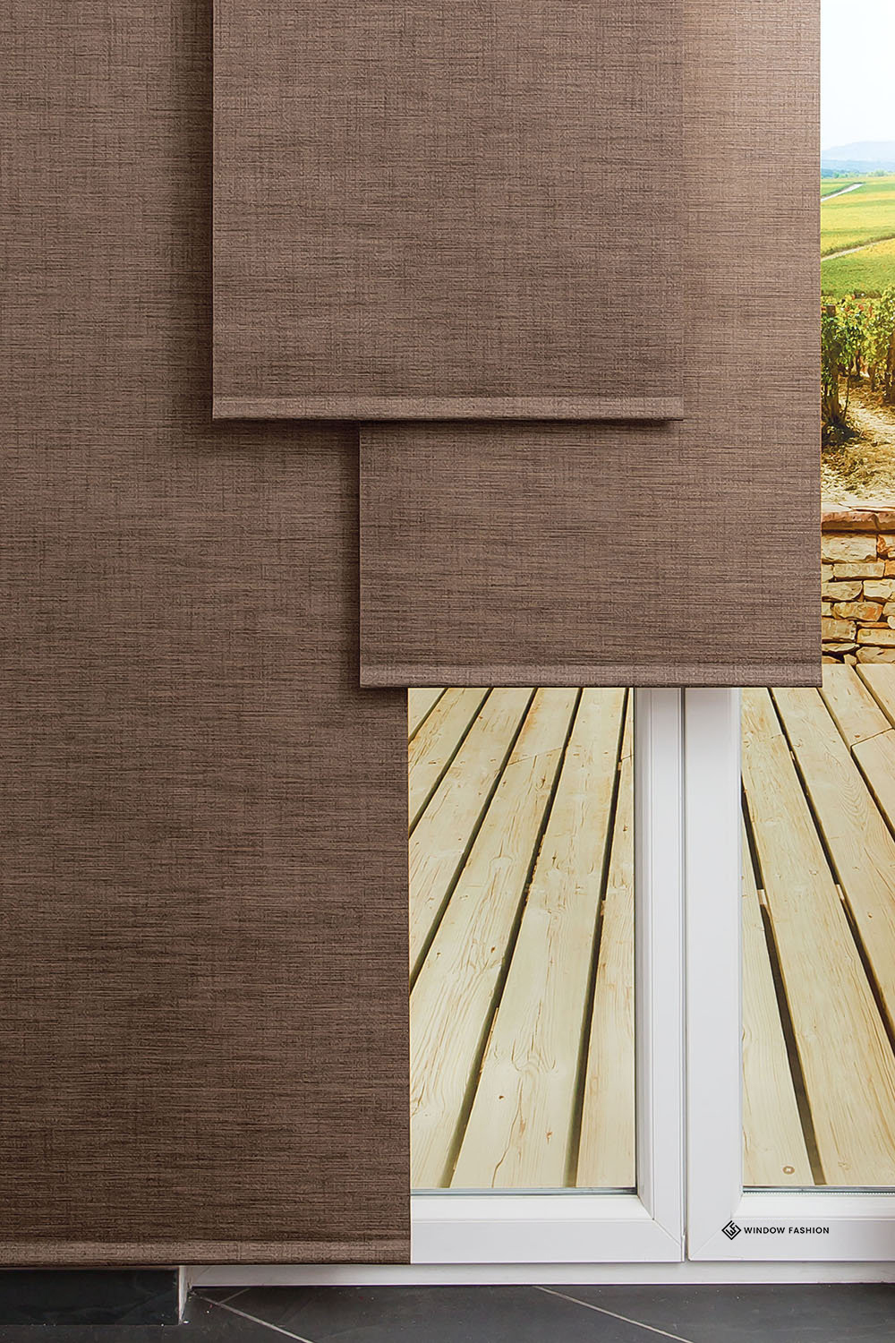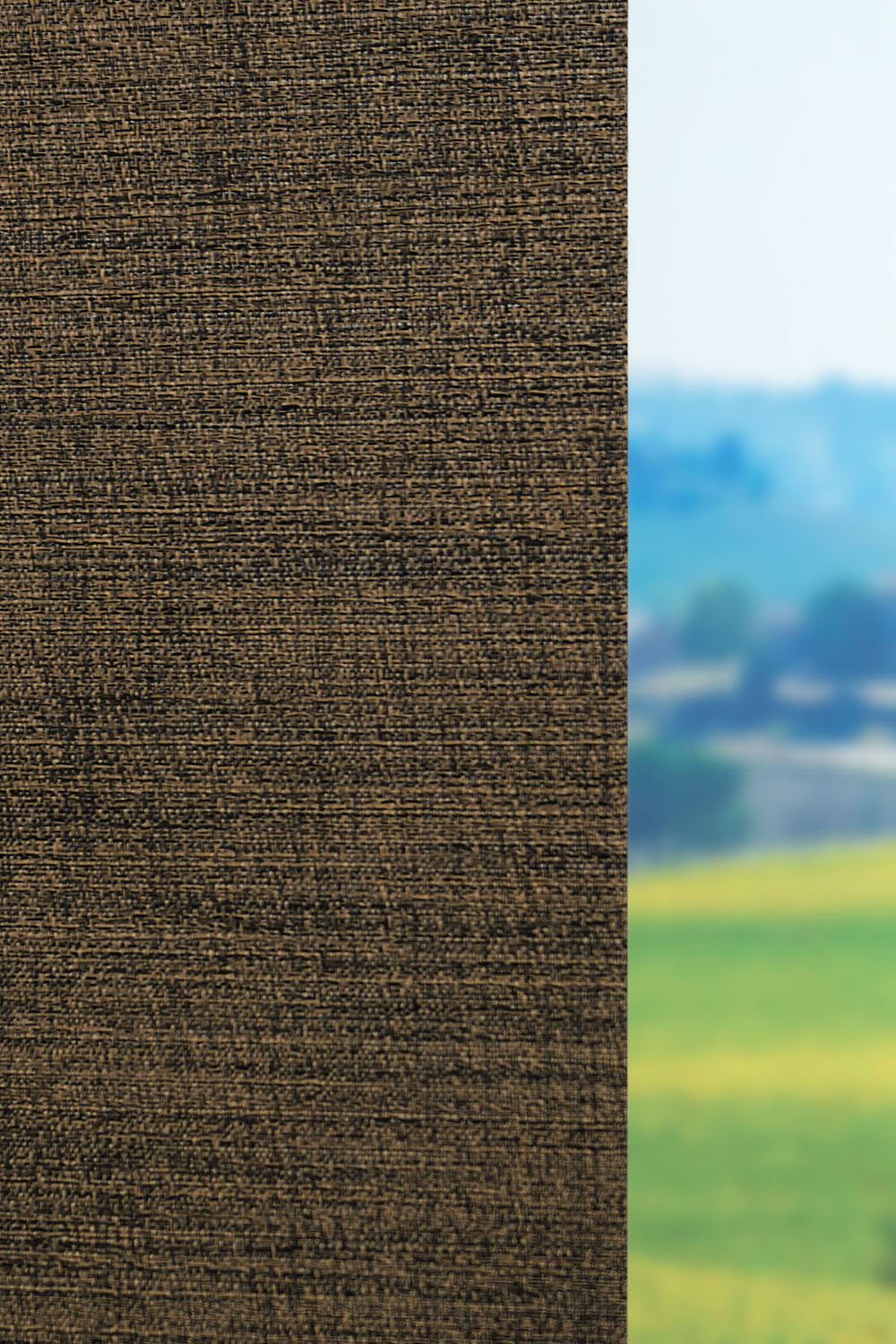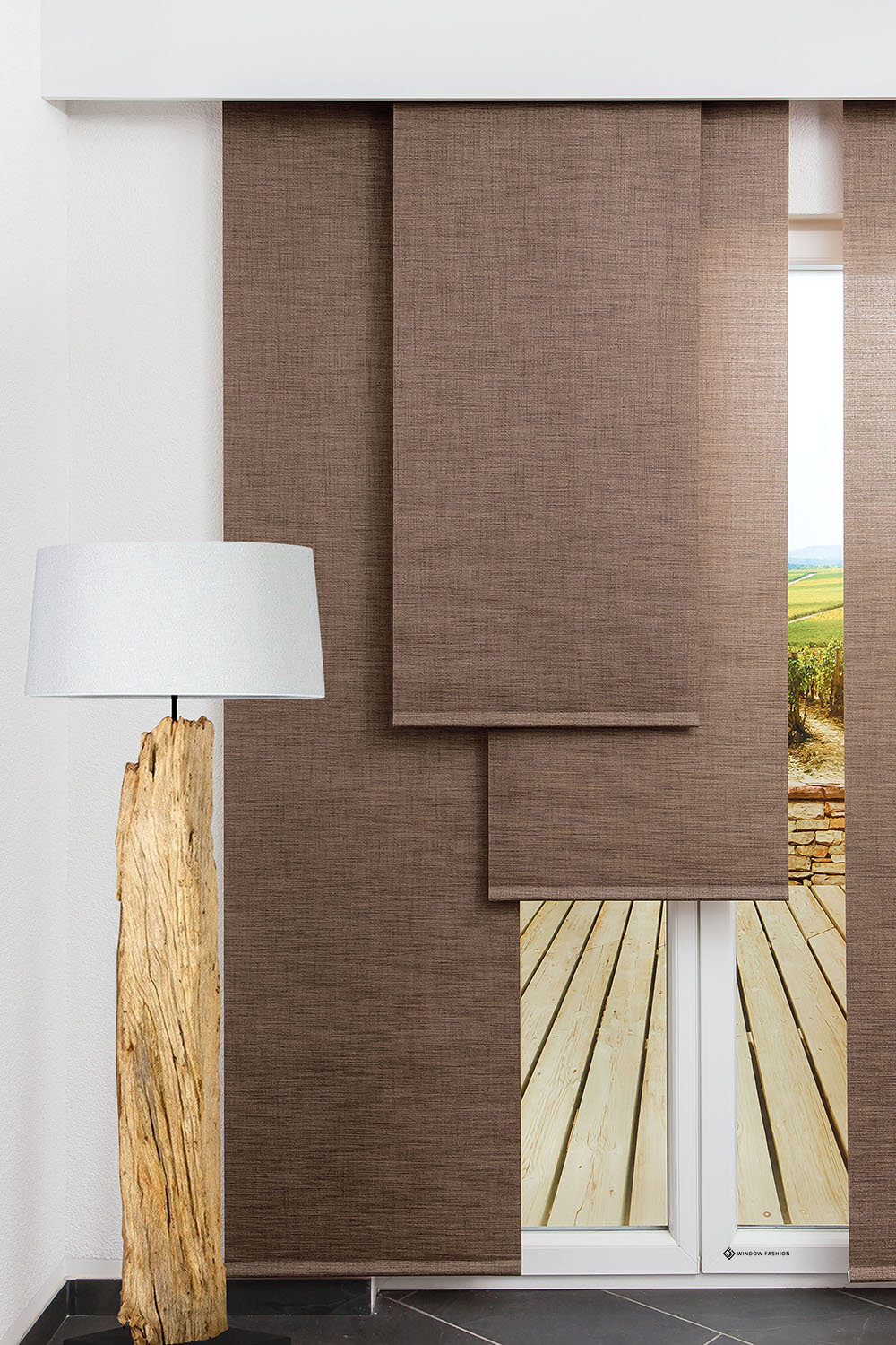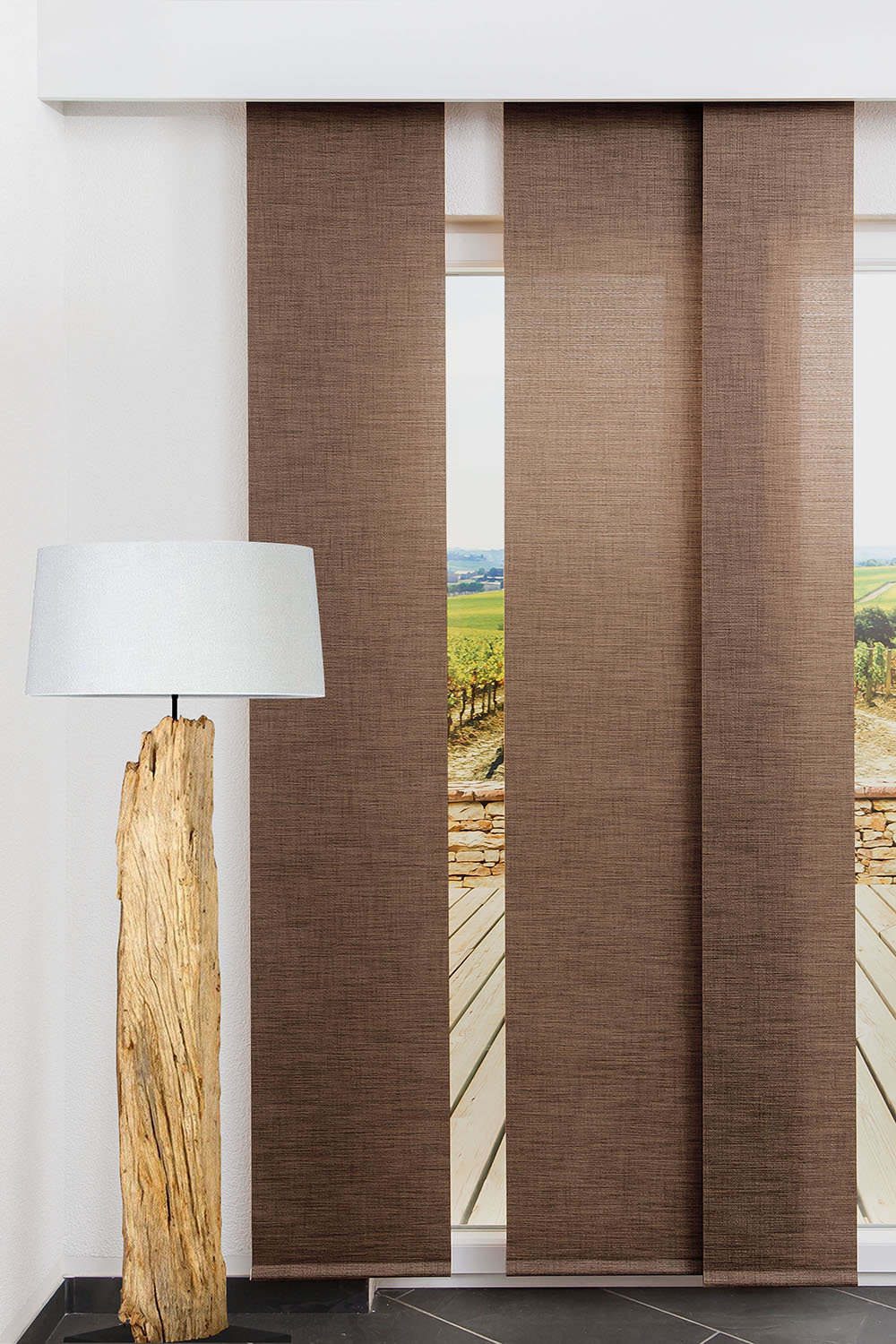 Kleine Quadrate, die sich versetzt, aber durchgängig aneinanderschmiegen, bilden das Muster dieses Flächenvorhangmodells. Dabei wechseln sich in dem Stoff, die matteren mit den schimmernden Quadratpaaren ab. Die Optik erinnert daher entfernt an ein Karomuster. In regelmässigem Abstand wird die Schiebegardine ausserdem immer wieder von sehr feinen Längslinien unterbrochen, die etwas mehr Helligkeit in den Raum lassen als der übrige Stoff, ohne jedoch den Sichtschutz von beleuchteten Innenräumen zu beeinträchtigen. Licht und Wärme werden hervorragend reflektiert. Als Blendschutz von Bildschirmarbeitsplätzen kann der Behang ebenso eingesetzt werden wie in Räumen mit hoher Luftfeuchtigkeit. Auch in punkto Pflegeeigenschaften bringt das Polyestergewebe einige Vorteile mit sich. Durch feuchtes Abwischen lassen sich Verschmutzungen bequem beseitigen. Blasses Braun strahlt Gemütlichkeit und Geborgenheit aus, passend zu einer Einrichtung, die ansonsten von Weiss dominiert wird. Ein blassbrauner Flächenvorhang kommt vor hellen Holzfarben besonders schön zur Geltung. Zu Türkis, Gelb, Violett, intensivem Blau oder anderen leuchtenden Farben bietet er einen schönen Kontrast. Verbindungen mit Grau und Beige sorgen für Ruhe und Ausgleich.