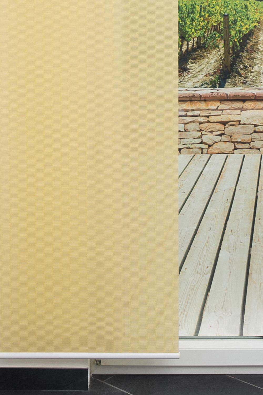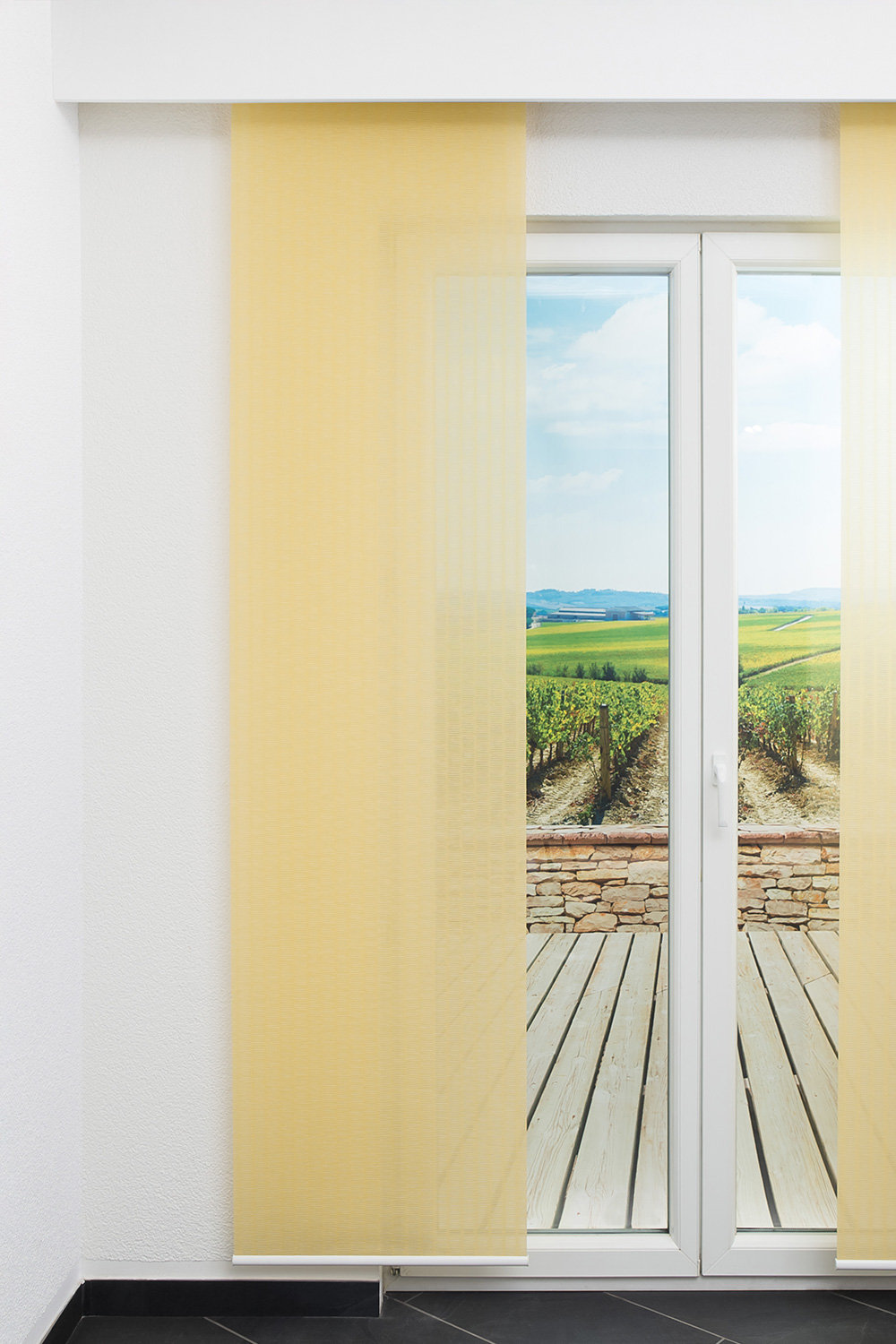 Sie lieben den Lichteinfall und das Spiel von Licht und Schatten am Fenster? Dennoch suchen Sie nach einem Flächenvorhang, der Ihre Fenster dekorativ bereichert? Dieser transparente Stoff sorgt für Helligkeit im Raum, bietet am Tage aber auch optimalen Sichtschutz. Ein Flächenvorhang aus diesem Gewebe erscheint freundlich und luftig. Das vitale Design besteht ergibt sich aus vielen kleinen Stoffabschnitten mit hoher Transparenz, die so angeordnet sind, dass sich von Ferne der Eindruck breiter Längsstreifen ergibt. Mit dem Muster wird sozusagen ein Klassiker neu interpretiert. Die Schiebegardine öffnet sich modernen Umgebungen und kann auch zur Auflockerung von klassischen Einrichtungen beitragen. Die Kombinationsfreudigkeit der Farben lässt das Design je nach Bedarf mehr oder weniger stark zur Geltung kommen. Lassen Sie sich also einladen, mit Farben und Formen zu spielen und damit Ihren eigenen Stil ans Fenster zu bringen.