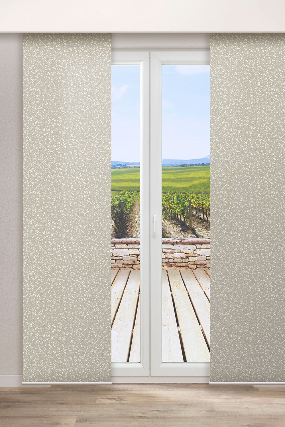 Dieser massgefertigte Flächenvorhang aus lichtdurchlässigem Polyester verzaubert mit seiner glatten Oberfläche und einem entzückenden floralen Design, welches eine Vielzahl von Zweigen mit zarten Blättchen kontrastreich in den Mittelpunkt stellt. Der Fensterschmuck kombiniert visuelle Anmut mit praktischer Funktionalität. Seine Lichtdurchlässigkeit steht für die perfekte Balance zwischen Helligkeit und Sichtschutz. Abhängig vom gewählten Farbton wird Sonnenstrahlung angenehm getönt und leicht gedämpft. Der Stoff bietet ausserdem starken Wärmeschutz, ist damit ideal für den Einsatz im Wohnbereich. Feuchtraumtauglichkeit und die Eignung für Bildschirmarbeitsplätze bereichern die Flexibilität. Die Schiebegardine erfüllt den Oekotex Standard 100, ist frei von PVC und Halogenen und lässt sich bequem mit einem feuchten Tuch reinigen, was sie zu einer umweltfreundlichen und pflegeleichten Ergänzung für jeden Raum macht.