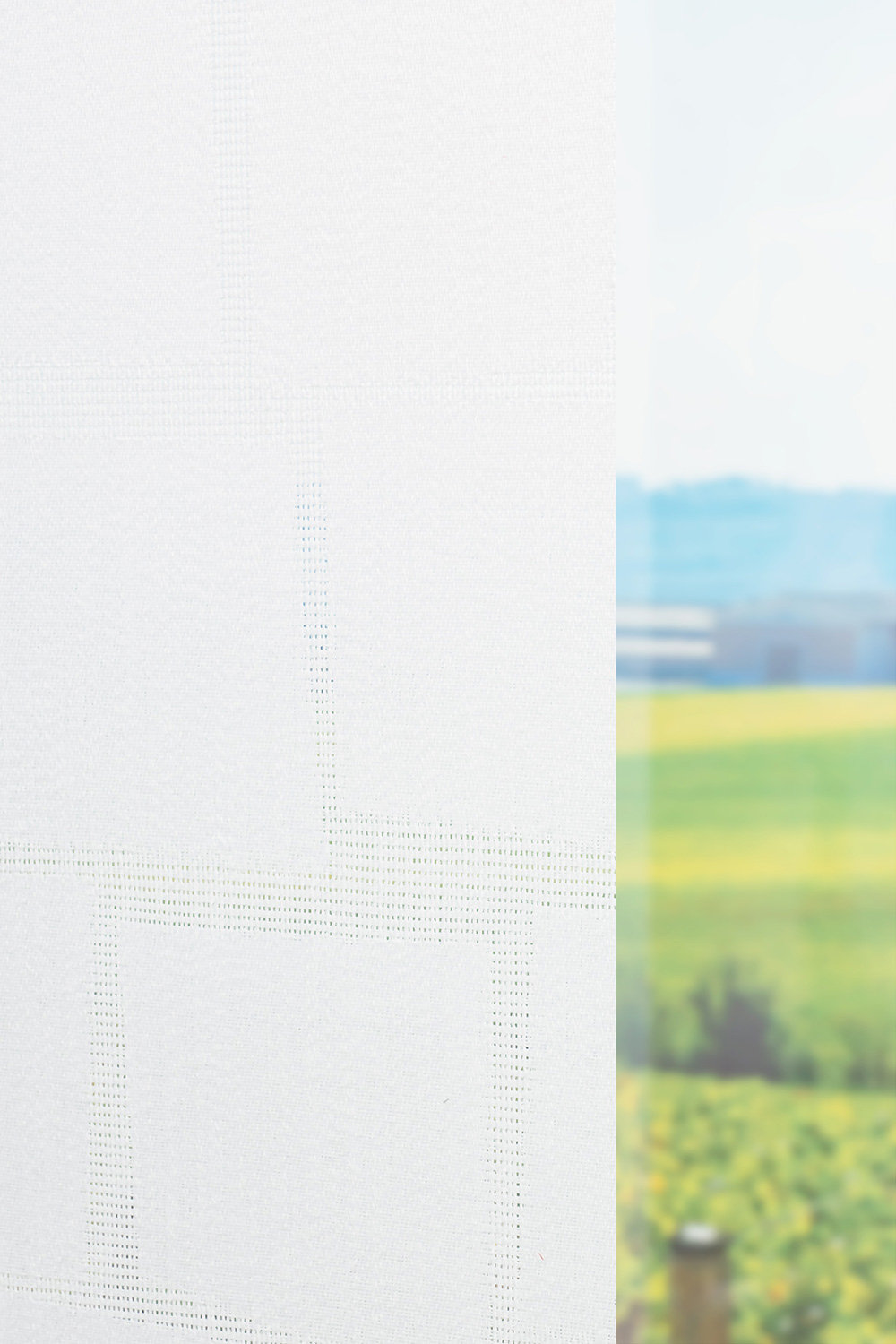 Mit diesem Flächenvorhang lassen sich unterschiedliche Dekorationsideen umsetzen. Durch das grafische Design in klassischen Farben haben Sie die Wahl, ob Sie Ihr Fenster mit einem Hingucker in einem ausdrucksstarken Ton oder einem stilvollen Fensterschmuck in einer leisen Nuance schmücken möchten. Das durchgängige Musterauf dem strukturierten Stoff erinnert ein bisschen an leicht versetzt aufeinander geschichtete Ziegelsteine. Dieser vielseitige Fensterbehang kann nicht nur Ihrem Wohnraum ein reizvolles Ambiente verleihen, er ist durch seine Feuchtraumeignung in Bad und Küche einsetzbar, schwer entflammbar und durch das Abwischen mit einem feuchten Tuch auch leicht zu reinigen. Dem transparenten Vorhang gelingt es, die Sonnenstrahlen von aussen etwas milder wirken zu lassen und dabei den Raum in eine freundliche und einladende Atmosphäre zu tauchen. Dabei kann er am Bildschirmarbeitsplatz als Blendschutz dienen und das Arbeiten am PC entspannter gestalten.