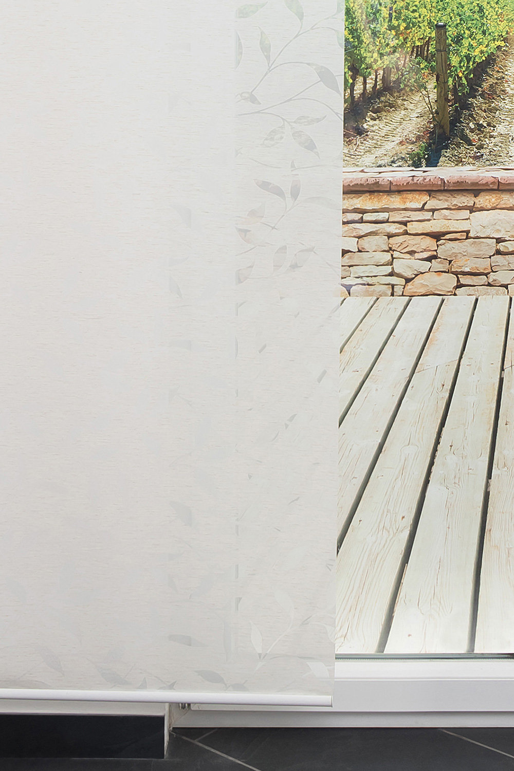 Es ist vor allem der beigefarbene Hintergrund mit seiner fein melierten Optik in verschiedenen Brauntönen, der diesen transparenten Flächenvorhang so warm und freundlich wirken lässt. Dabei sind die grossen, abstrakten Blätterranken transparent gestaltet, so können effektvolle Licht- und Schattenspiele entstehen. Durch die hindurchtretenden Sonnenstrahlen wird der Ausdruck dieses Flächenvorhangs noch intensiviert, er vermittelt auch eine gewisse Natürlichkeit. Aufgrund dieser Optik und des dezenten Musters ergeben sich vielfältige Kombinationsmöglichkeiten. Edel und stilvoll erscheint die Verbindung mit Weiss; verwandten Erdtönen tragen sowohl zu einem stimmigen Gesamtbild als auch zu einem heimeligen und wohnlichen Ambiente bei. Der Stoff ist schwer entflammbar und lässt sich durch das Abwischen mit einem feuchten Tuch leicht reinigen.