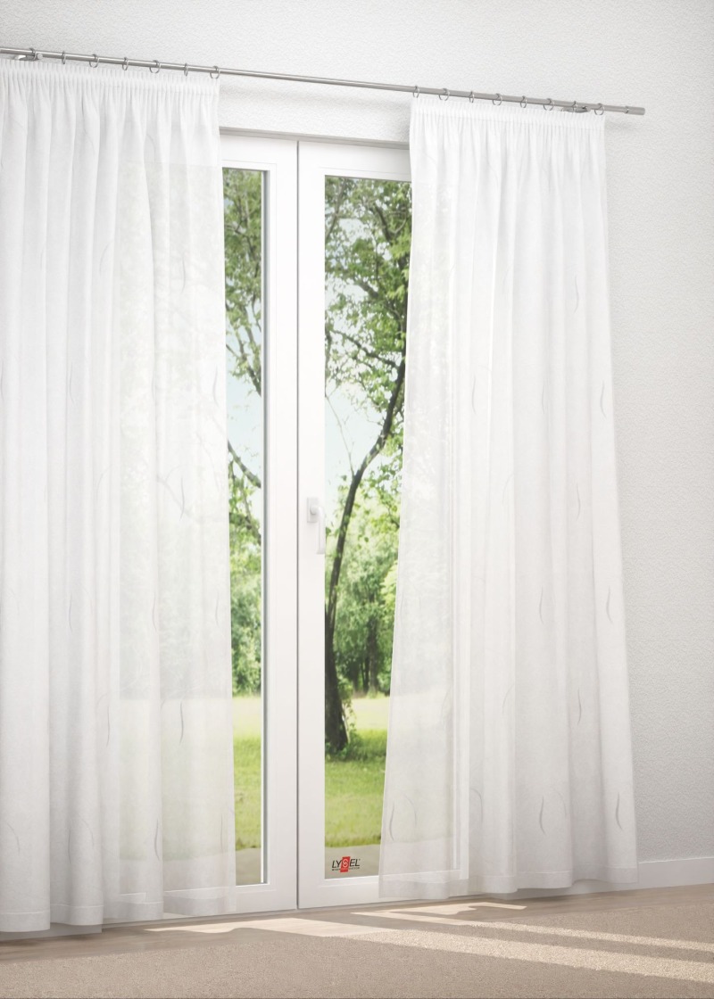 Fein und dezent wirkt dieser Voile Stoff mit reizvoller Crush-Optik und vielen glänzenden, floral geschwungenen Details. Das zarte, durchsichtige Polyestergewebe ist eine stilvolle und elegante Umrahmung, vor allem wenn es als Fensterdeko verwendet wird, bei der das eingefügte Bleiband für einen schönen Fall sorgt. Einen Gardinenschal oder ein Raffrollo können Sie im Konfigurator nach Mass zusammenstellen, dabei unter anderem die Aufhängung auswählen. Das transparente Polyestergewebe sorgt dafür, dass viel Licht in den Raum kommt, dieser offen und freundlich wirkt. Für einen geschmackvollen Tischläufer kann dieser Stoff ebenfalls verwendet werden. Die Struktur der Tischplatte bzw. die darunterliegende Tischdecke lässt er hervorkommen. Für die Umsetzung eigener kreativer Ideen bieten wir den Stoff auch als Meterware an.