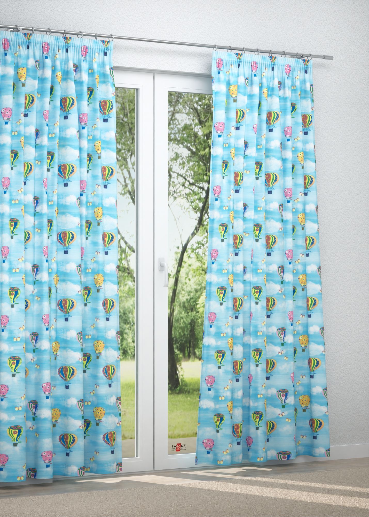Ein fröhliches, leicht und unbeschwert wirkendes Motiv wurde hier per Transferdruck auf den Stoff gebracht. Die HeissluftMikkelis, die abwechslungsreich mit bunten Mustern gestaltet sind, schweben unterschiedlich hoch in der Luft. Kleine Wolken und in Gruppen flatternde Schmetterlinge leisten ihnen Gesellschaft. Nehmen Sie die Meterware und nähen Sie individuelle Accessoires fürs Kinderzimmer selbst. Alternativ ermöglicht es der Konfigurator, beispielsweise eine Fensterdeko wunschgemäss zu gestalten. Auf einem massgefertigten Raffrollo oder einem Gardinenschal nach Mass kommt das Design besonders gut zur Geltung. Das lichtdurchlässige Polyestergewebe sorgt dafür, dass weiterhin mildes Licht in den Raum kommt, Sie dabei stets vor neugierigen Blicken geschützt sind. Selbst bei eingeschalteter Beleuchtung sind höchstens grobe Umrisse erkennbar. Das frische, zugleich intensive Hellblau verleiht dem Raum eine angenehm luftige und offene Atmosphäre.