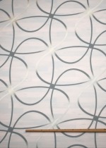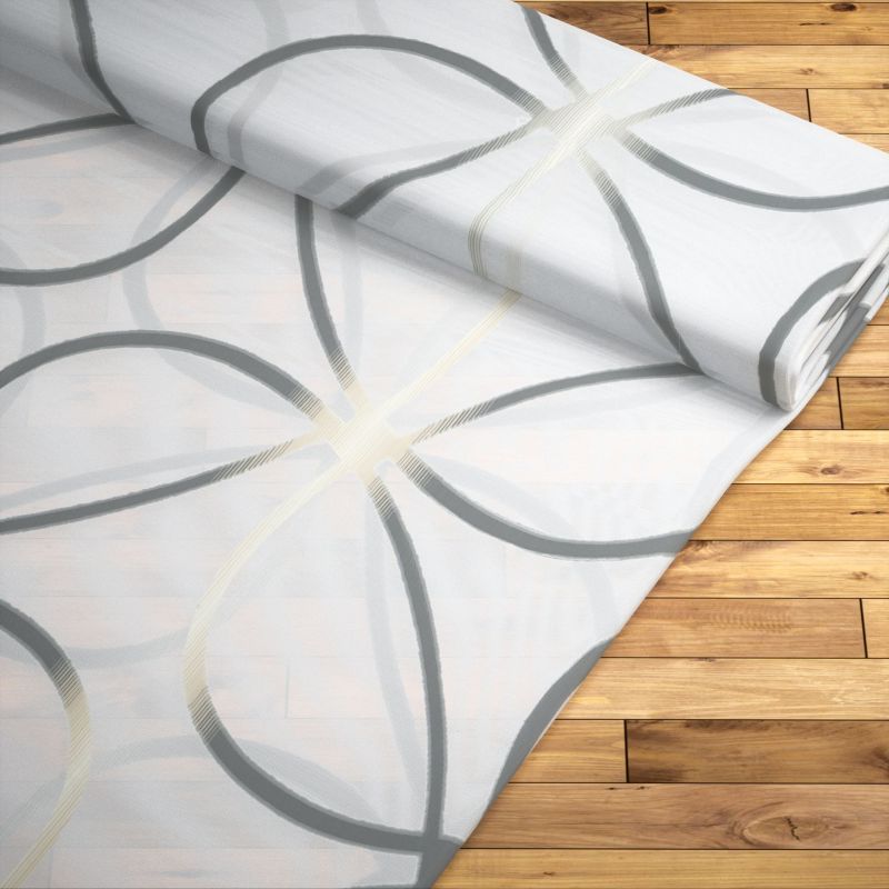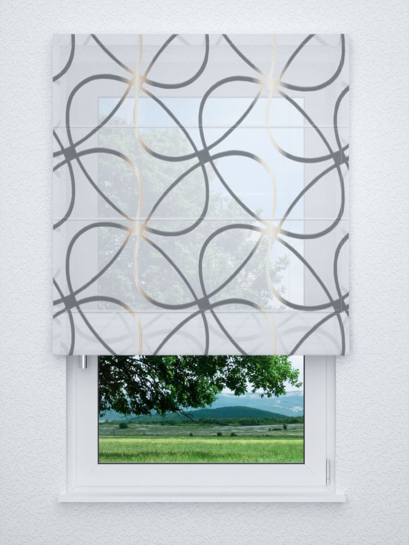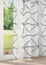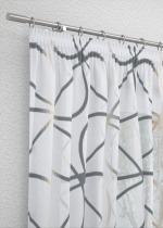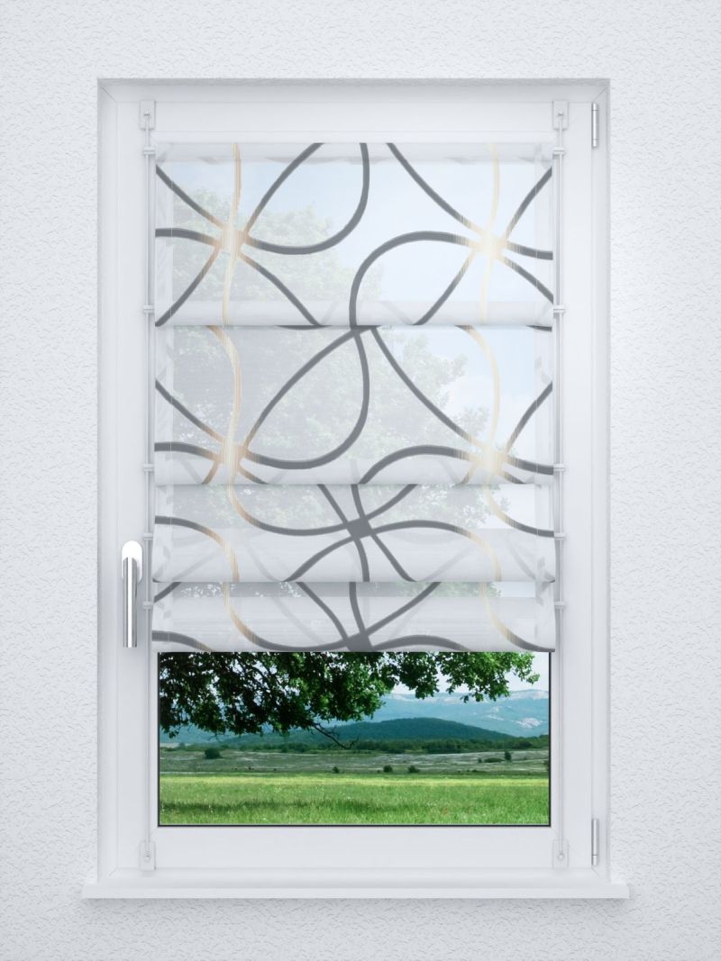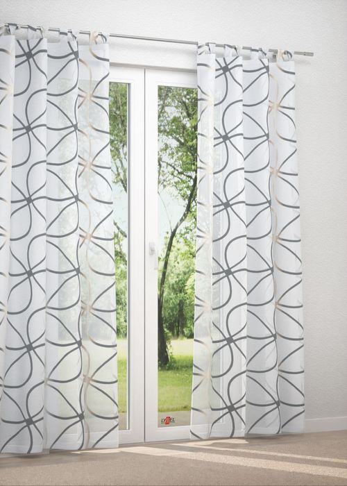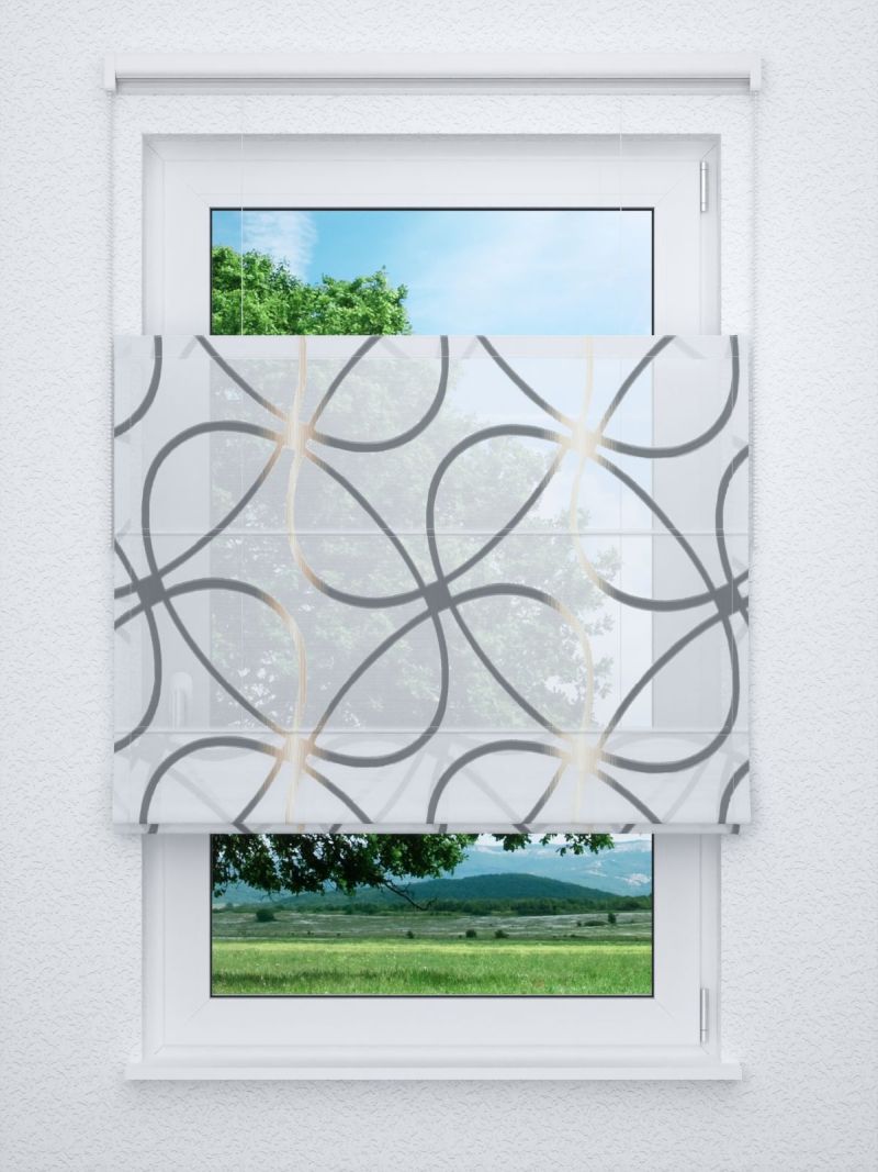Das Design dieses Stoffes wird massgeblich von dünnen, grosse Schlaufen bildenden Linien bestimmt. Da sie jeweils an einer Stelle zusammenlaufen, erinnern sie an grosse Blütenblätter, deren Zentrum mit zweifarbigen Schraffuren gestaltet ist. Die ausgefransten Ränder deuten darauf hin, dass es sich hierbei um ein Scherli-Muster handelt, das mit zusätzlichen Kett- und Schussfäden in den Stoff eingewebt wurde. Der transparente Polyesterstoff macht besonders als Fensterdeko eine gute Figur, er lässt viel Licht in den Raum, lediglich intensive Sonnenstrahlen erscheinen milder und etwas gedämpft. Ihr massgefertigtes Raffrollo oder Ihren Gardinenschal nach Mass können Sie im Konfigurator individuell zusammenstellen. Für eine Tischdecke oder einen Tischläufer lässt sich der Stoff ebenfalls verwenden. Zusätzlich wird er als Meterware angeboten, sodass Sie auch eigene kreative Ideen umsetzen können.