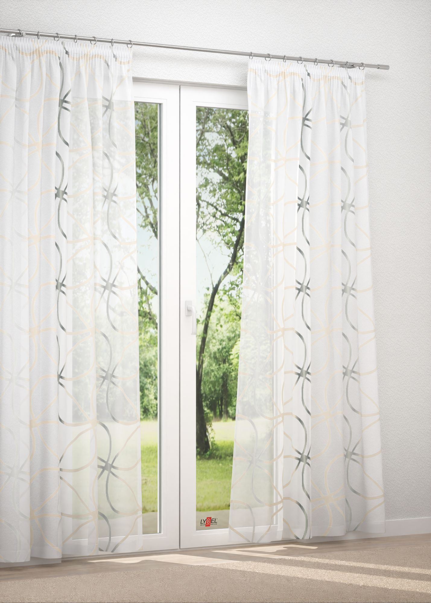 Das Design dieses Stoffes wird massgeblich von dünnen, grosse Schlaufen bildenden Linien bestimmt. Da sie jeweils an einer Stelle zusammenlaufen, erinnern sie an grosse Blütenblätter, deren Zentrum mit zweifarbigen Schraffuren gestaltet ist. Die ausgefransten Ränder deuten darauf hin, dass es sich hierbei um ein Scherli-Muster handelt, das mit zusätzlichen Kett- und Schussfäden in den Stoff eingewebt wurde. Der transparente Polyesterstoff macht besonders als Fensterdeko eine gute Figur, er lässt viel Licht in den Raum, lediglich intensive Sonnenstrahlen erscheinen milder und etwas gedämpft. Ihr massgefertigtes Raffrollo oder Ihren Gardinenschal nach Mass können Sie im Konfigurator individuell zusammenstellen. Für eine Tischdecke oder einen Tischläufer lässt sich der Stoff ebenfalls verwenden. Zusätzlich wird er als Meterware angeboten, sodass Sie auch eigene kreative Ideen umsetzen können.