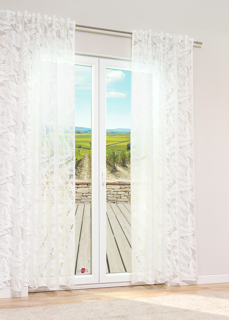 - Ein halbtransparenter Vorhang aus 78% Viskose, 22% Polyester.