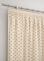 Fein, dezent und modern wirkt dieser unifarbene Dekostoff mit den kleinen Sternchen. Gleichmässig sind diese auf der Oberfläche verteilt und sorgen für ausdrucksstarke Kontraste, genauso für ein ruhiges, harmonisches Design. Der helle Stoff und das dunkle Muster sind charakteristisch für dieses Modell. In ein reduziertes und cleanes Interieur oder auch in eine vom Landhausstil inspirierte Wohnumgebung passt dieser Stoff besonders gut. Das lichtdurchlässige, blickdichte Gewebe besteht aus Baumwolle, lässt sich schonend bei 30 Grad in der Maschine reinigen. An den Seiten und am Abschluss ist der Stoff gesäumt.