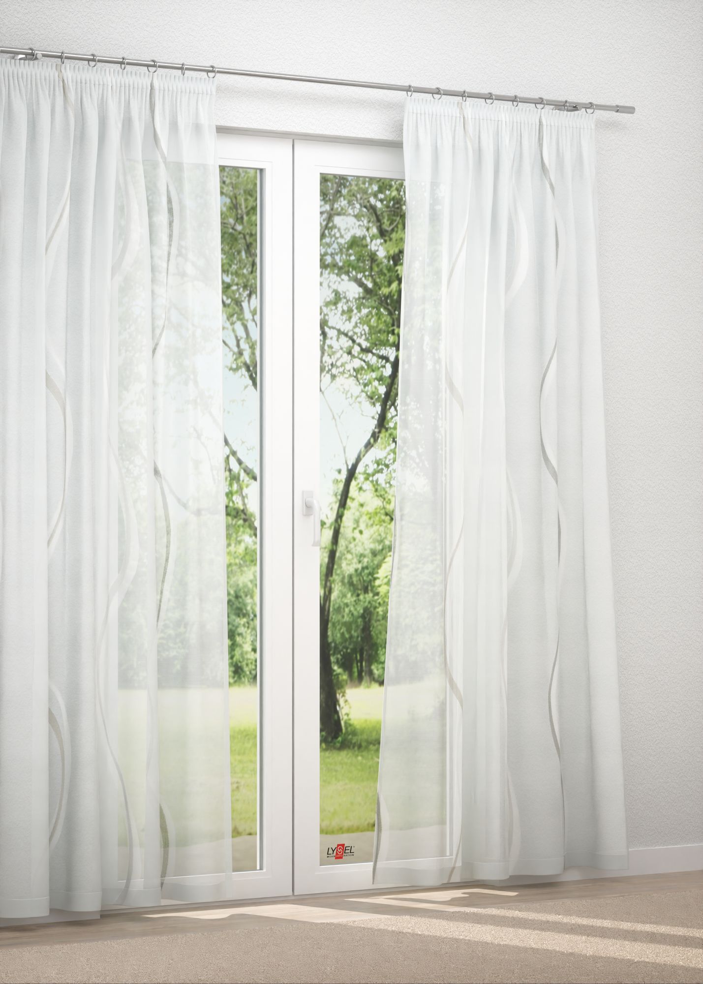 Durch die per Scherli-Webtechnik in den Stoff eingefügten Wellenlinien erfährt das Design eine gleichförmige, fliessende Bewegung. Dabei sind die Wellen in zwei unterschiedlichen Farben vorhanden, die sich harmonisch ergänzen. Auf einer Seite werden die Wellen noch von einem zarten Streifenmuster eingerahmt, welches sich von dem Stoff nur aufgrund der aufgeworfenen Fäden und seiner Struktur abhebt. Das transparente Polyestergewebe gibt sich als hauchfeines Gitternetz zu erkennen und lässt viel Licht hindurch. Speziell bei einem Gardinenschal nach Mass trägt das am Rand eingearbeitete Bleiband zu einem gleichmässigen Fall des Stoffes bei. Individuell konfiguriert und nach Mass gefertigt sind Raffrollos und Gardinenschals eine willkommene Auflockerung für nahezu jedes Interieur. Intensive Sonnenstrahlen wirken gedämpft, es kommt weiterhin viel mildes Licht in den Raum, was ihn optisch grösser und offener erscheinen lässt. Davon profitieren vor allem kleine und im Norden liegende Bereiche. Möchten Sie Accessoires auch selbst nähen, empfehlen wir die Meterware.