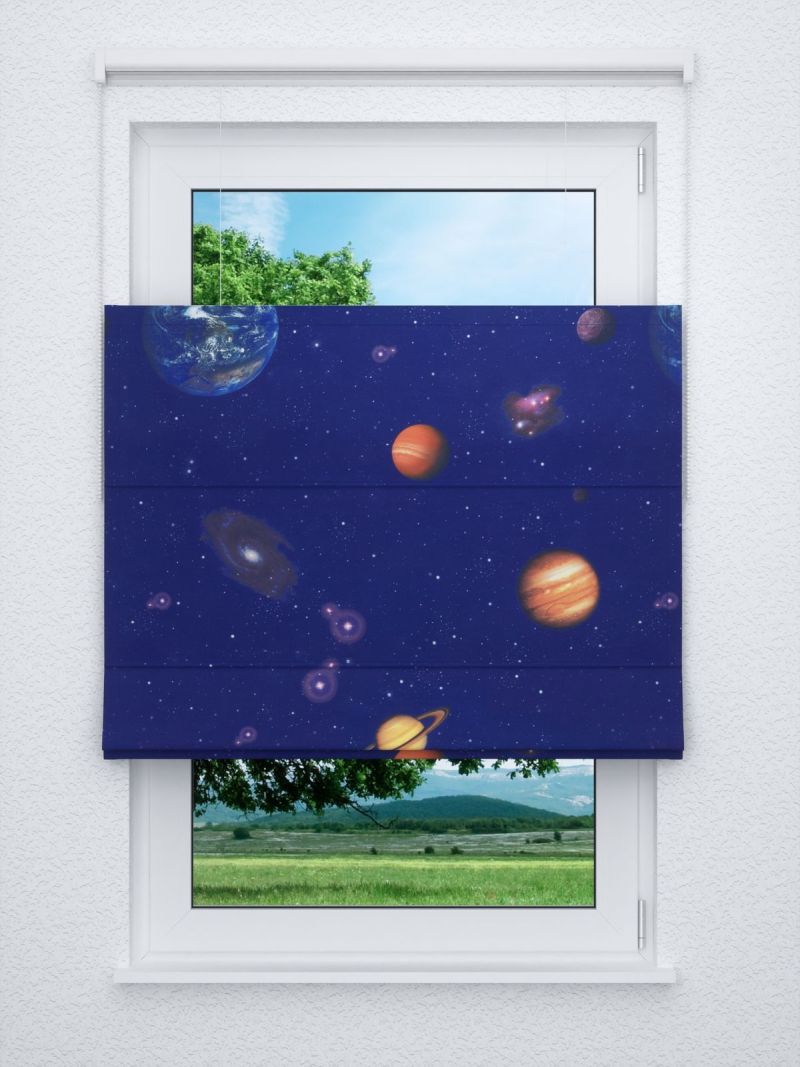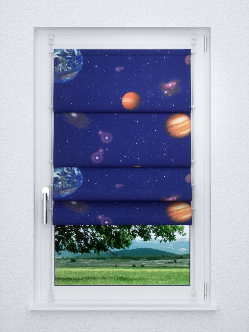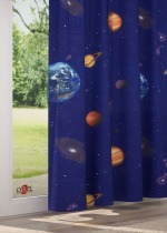 Eine Reise in die Galaxie, einen anderen Blick auf die Welt, das bietet das Design dieses Stoffes. Das Motiv ist auf die Vorderseite aufgedruckt, die Rückseite ist Weiss. Die verschiedenen Planeten wirken hier so nah und greifbar, so gross die Distanz in der Realität auch sein mag. Dazu versprüht der mit Sternen übersäte Himmel ein magisches Flair. Machen Sie eigene Gestaltungsträume wahr und kreieren Sie aus dem Stoff in Meterware individuelle Accessoires. Eine Fensterdeko, etwa ein massgefertigtes Raffrollo oder ein Gardinenschal nach Mass, wirkt besonders imposant. Der Konfigurator bietet Ihnen viele Möglichkeiten, die Fensterdeko zu Ihrer werden zu lassen. Das lichtdurchlässige Polyestergewebe wurde per Transferdruck gestaltet und trägt zu einem offenen und freundlichen Raumambiente bei. Als Sichtschutz hält der Stoff tagsüber wie abends neugierige Blicke fern.