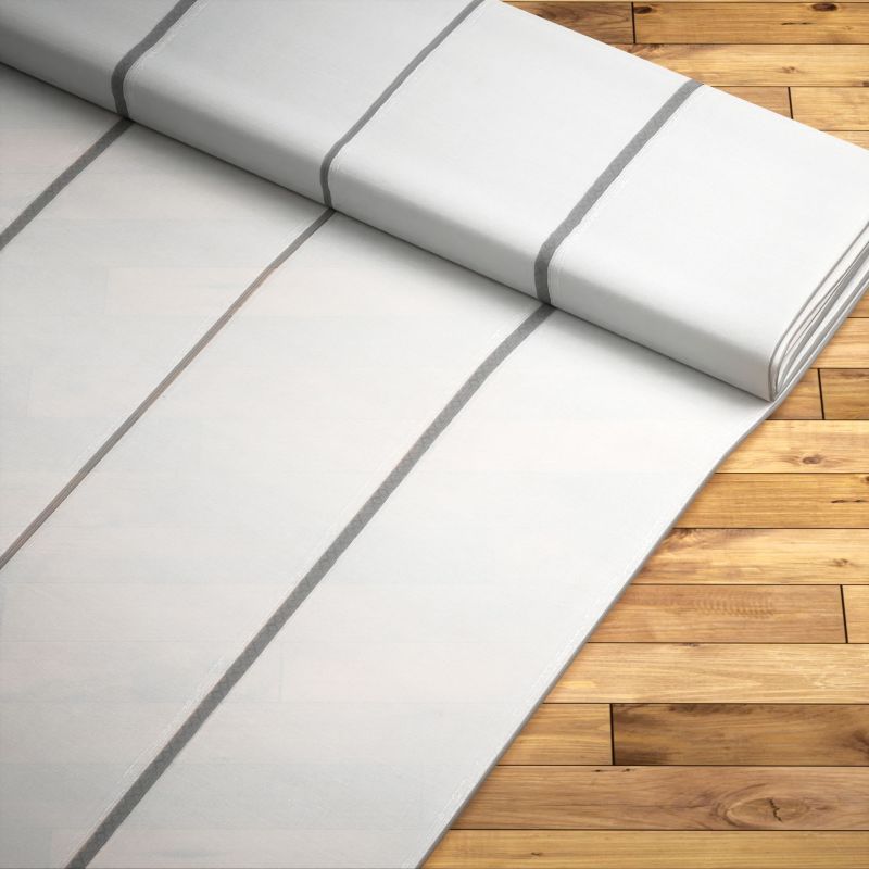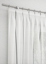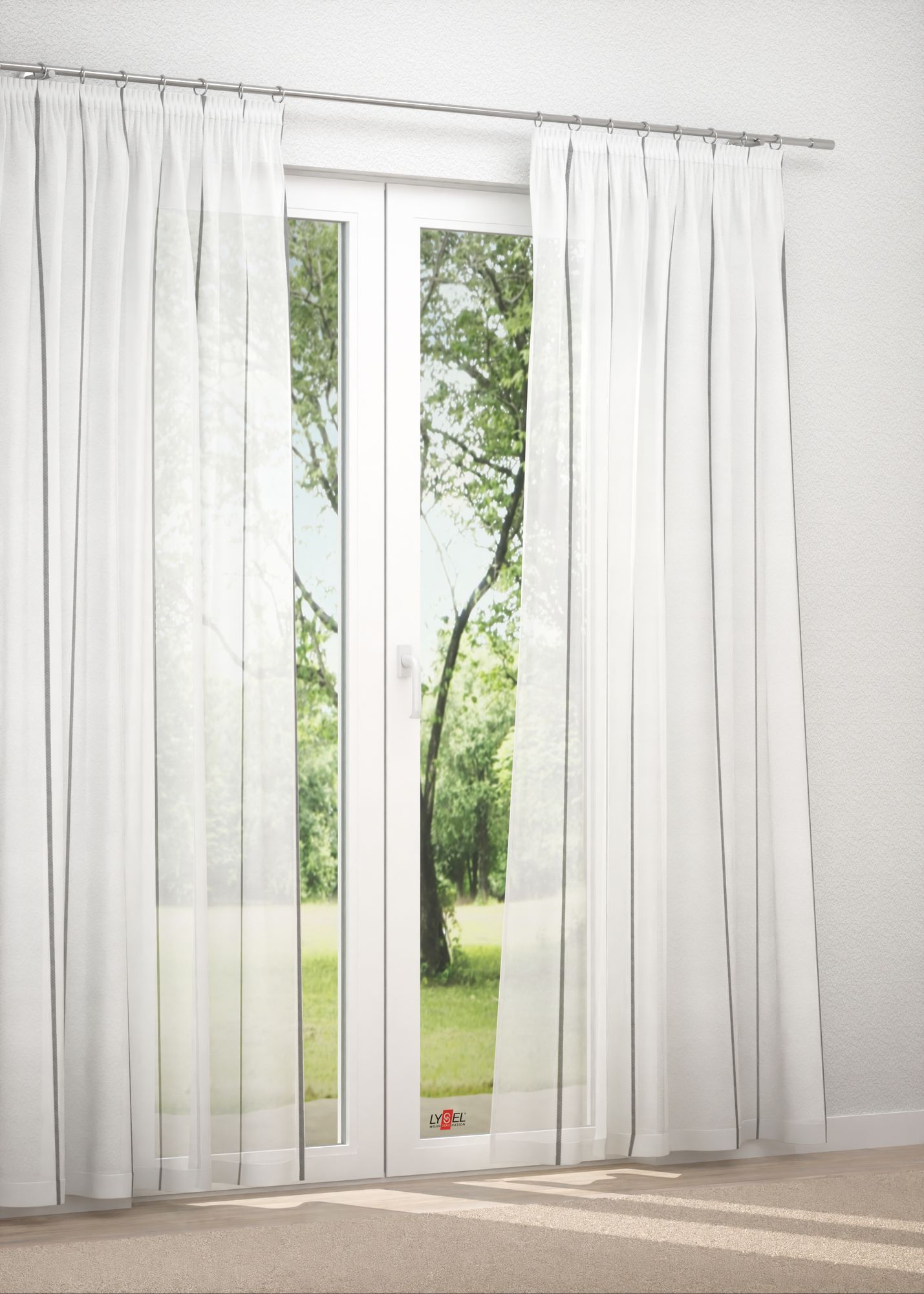 In seiner Struktur an feines Leinengewebe erinnernd trägt dieser transparente Polyesterstoff zu einem angenehmen und luftigen Ambiente bei. Er ist abwechselnd mit Streifen in unterschiedlichen Designs verziert. Eines davon zeigt ein Rautenmuster, das andere besteht aus drei feinen Linien. Da die beiden Streifen in derselben Farbe gestaltet sind, wirkt das Gesamtbild ausgesprochen harmonisch. Durch die reduzierte, kontrastreiche Optik kann sich dieses Modell in moderne Wohnumgebungen gut einfügen. Als massgefertigte Fensterdeko macht dieser am Rand mit Bleiband versehene Stoff eine besonders gute Figur. Dieses sorgt für einen schönen Fall und eine gleichmässige Optik. Für die Aufhängung und den unteren Abschluss stehen im Konfigurator mehrere Möglichkeiten zur Auswahl. Damit können Sie Ihr individuelles Accessoire gestalten. Als Meterware bietet der Stoff die grösste gestalterische Freiheit.
