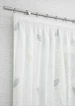 Eine angenehme Luftigkeit und eine zarte Eleganz bringt der transparente weisse Stoff in den Raum. Die Blätter in naturnahem Beige greifen den Charakter des Designs wieder auf, währenddessen sorgen die silbern glitzernden Elemente für einen stilvollen, festlichen Moment. Gedeckte Grüntöne und helle Naturfarben passen besonders gut dazu. Das Silber können Sie ebenfalls in Ihrer Deko aufgreifen.
