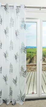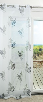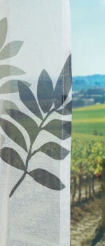 Die Blätter, die an die einer Esche erinnern, sind auf dem hellen Hintergrund in Dreier-Konstellationen angeordnet. Sie unterscheiden sich in Grösse, Ausrichtung und Intensität der Farbe. Mit dem transparenten Stoff am Fenster wirkt der Raum heller und offener, es kommt viel Licht hindurch. Da der Ösenschal in erster Linie dekorative Zwecke erfüllt, lässt er sich wunderbar mit anderen, blickdichten Vorhängen kombinieren und an einer Gardinenstange aufhängen. Das Polyestergewebe ist an den Seiten und am Abschluss gesäumt; gern kürzen wir die angegebene Fertiggrösse auf eine für Ihre Fenster passende Länge.