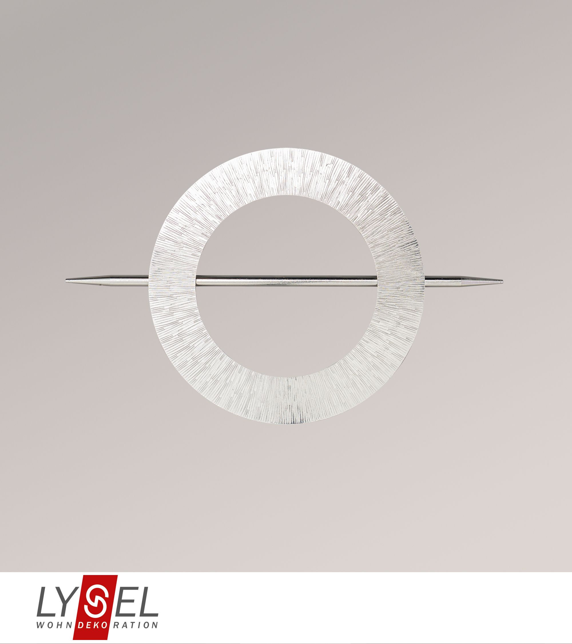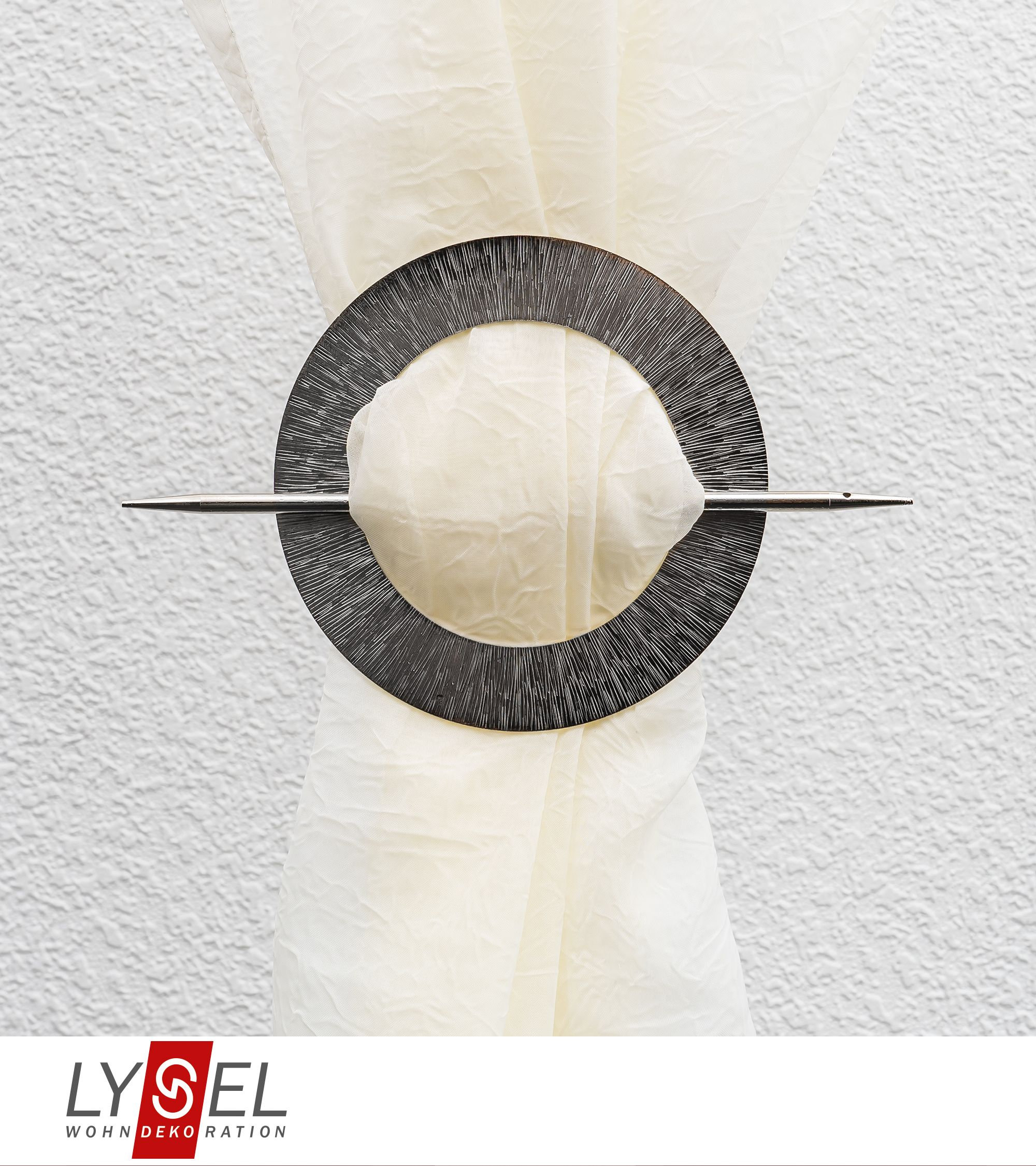 Das Lysel Outlet Design besteht aus einem transparent weissen Hintergrund, der mit einem Blatt-Kreis-Muster bedruckt ist. Dieses besteht aus unterschiedlich grossen Kreisen, aus denen Blätter negativ ausgespart sind. Die Blätter sind, wie auch der Hintergrund des Stoffes weiss, die Kreise in einem hellen und einem dunklen Braunton gehalten. Entsprechend passt der Vorhang gut in eher herkömmlich eingerichtete Wohnräume mit warmen Erdtönen.