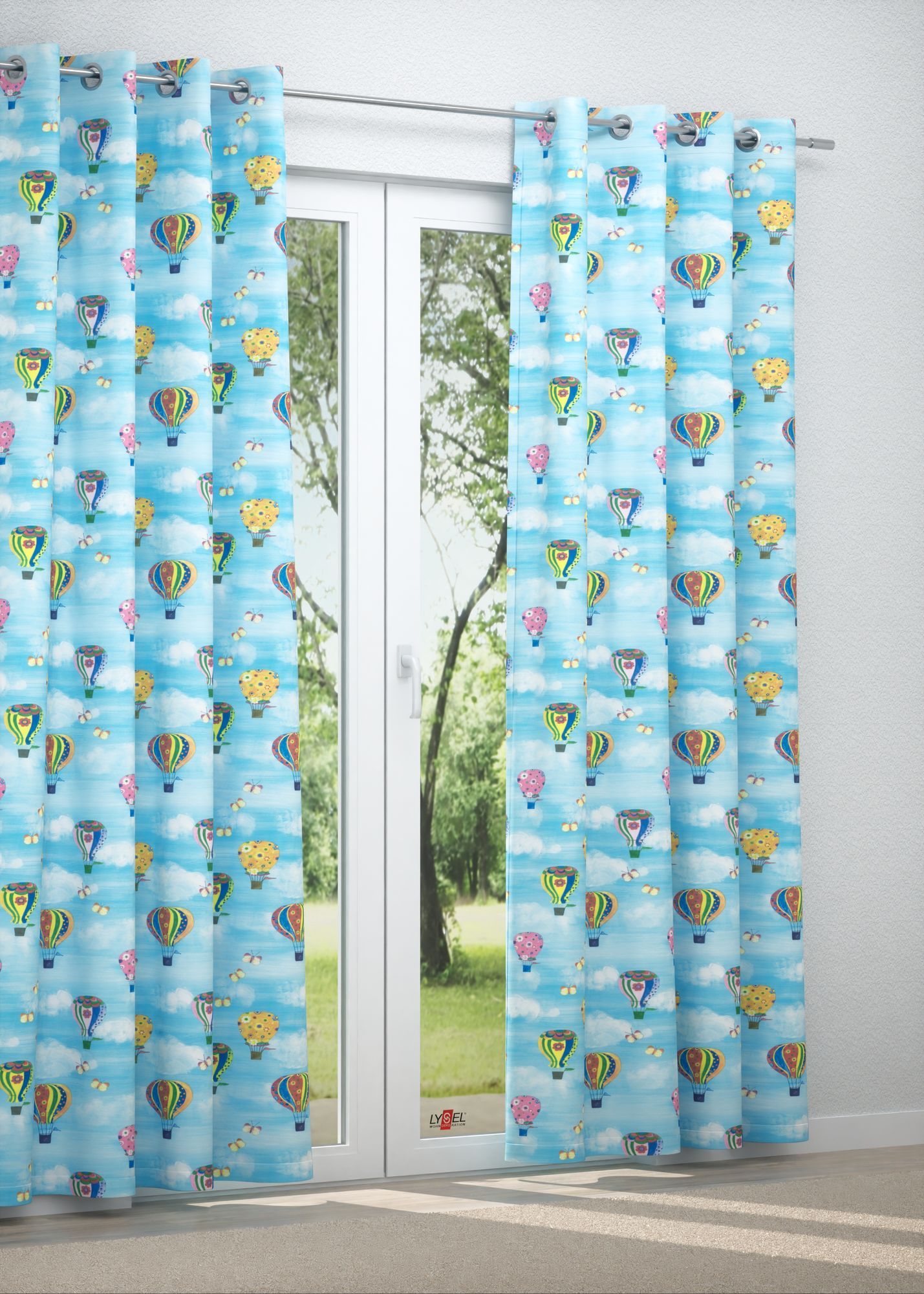 Ein fröhliches, leicht und unbeschwert wirkendes Motiv wurde hier per Transferdruck auf den Stoff gebracht. Die HeissluftMikkelis, die abwechslungsreich mit bunten Mustern gestaltet sind, schweben unterschiedlich hoch in der Luft. Kleine Wolken und in Gruppen flatternde Schmetterlinge leisten ihnen Gesellschaft. Nehmen Sie die Meterware und nähen Sie individuelle Accessoires fürs Kinderzimmer selbst. Alternativ ermöglicht es der Konfigurator, beispielsweise eine Fensterdeko wunschgemäss zu gestalten. Auf einem massgefertigten Raffrollo oder einem Gardinenschal nach Mass kommt das Design besonders gut zur Geltung. Das lichtdurchlässige Polyestergewebe sorgt dafür, dass weiterhin mildes Licht in den Raum kommt, Sie dabei stets vor neugierigen Blicken geschützt sind. Selbst bei eingeschalteter Beleuchtung sind höchstens grobe Umrisse erkennbar. Das frische, zugleich intensive Hellblau verleiht dem Raum eine angenehm luftige und offene Atmosphäre.
