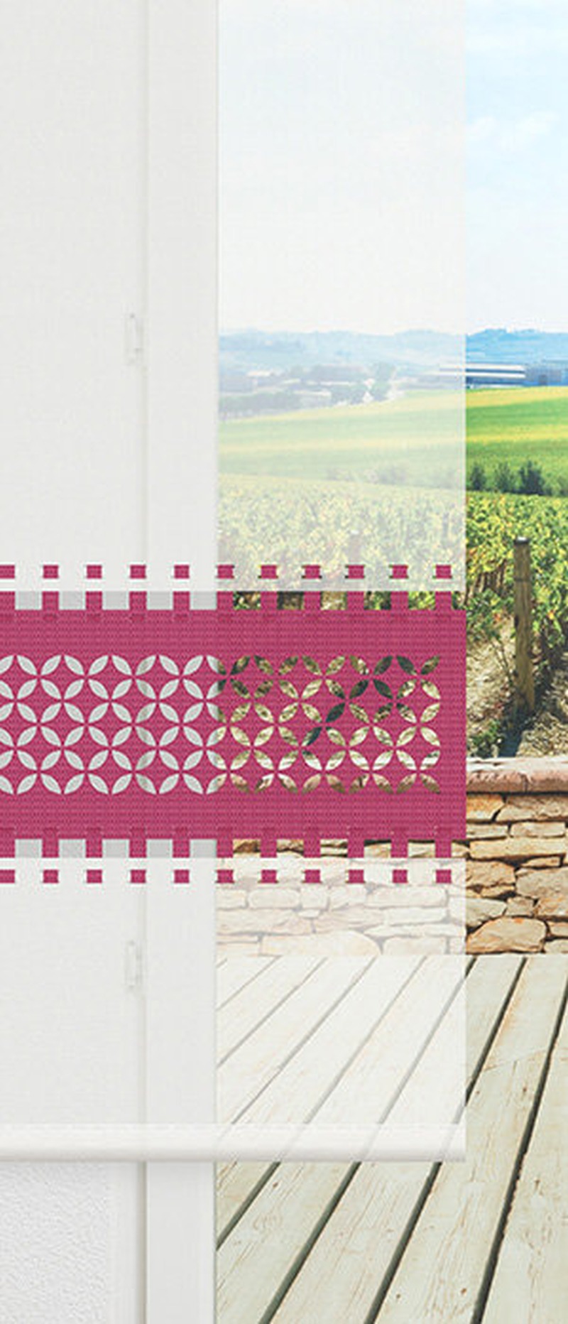 Auf dem hellen Stoff präsentieren sich glänzende Streifen in den fröhlichen Sommerfarben Rosa, Pink und Orange. Eine aufgeweckte und ausgelassene Aura verbreitet sich heiter-beschwingt im Raum. Viel frisches Weiss, helle Holztöne sowie stylische Korb- und Rattanstühle tragen zu einem entspannten und lockeren Flair bei. Aufregende Akzente setzen Sie mit Violett und leuchtenden Gelb- und Grüntönen.