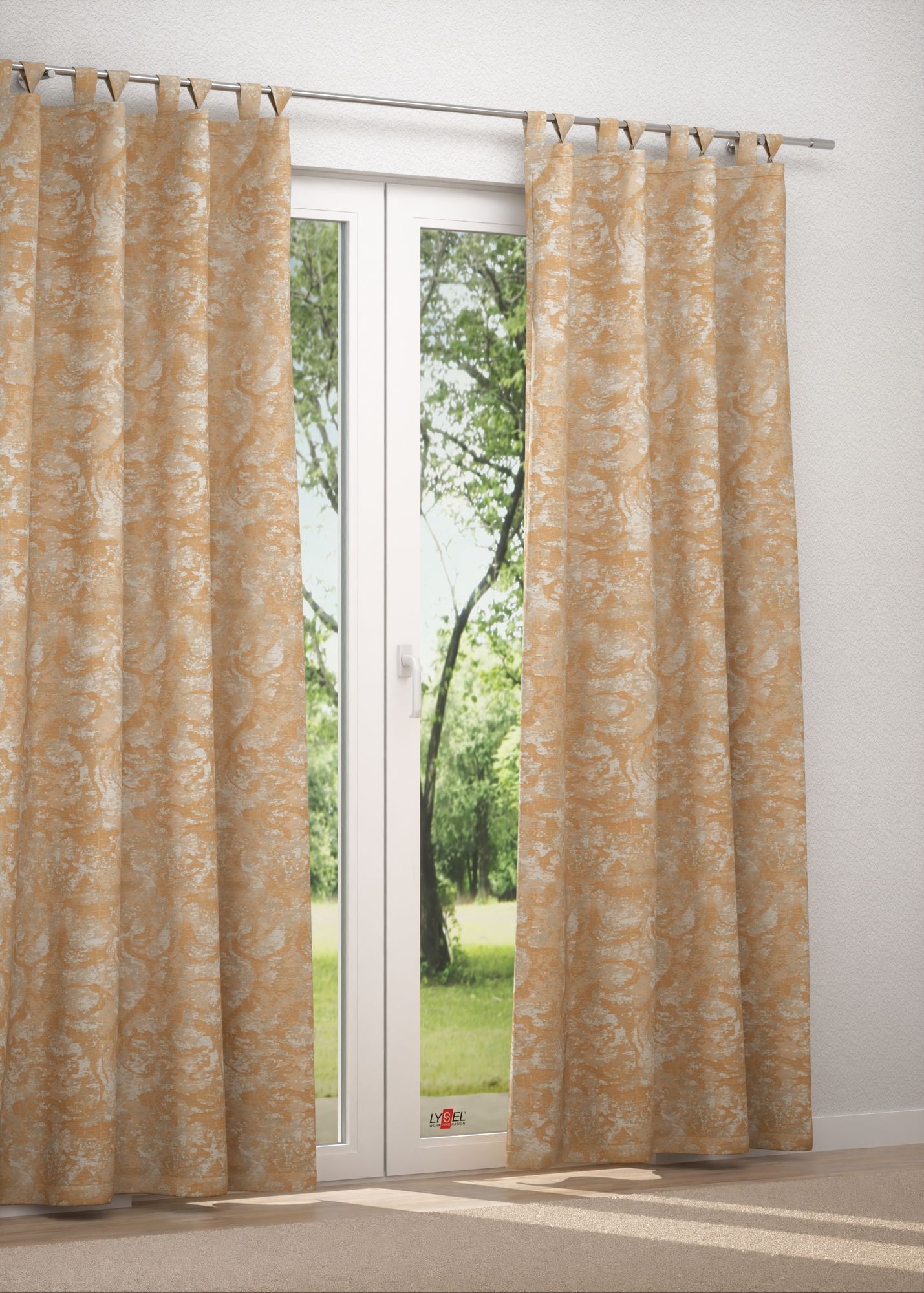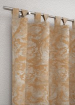 Dieser Stoff fällt durch seine Struktur und die zugleich edel wie natürliche wirkende, abwechslungsreiche Optik auf. Das glänzende und geschmeidige Material wurde mit an Ornamente erinnernden, geschwungenen Formen verziert, die sich stets in einer Farbwelt bewegen und teilweise ineinander überzugehen scheinen. Momente eines floralen Musters bringt das Design ebenfalls mit. Auf der Rückseite ist es in Negativ-Optik zu sehen. Der lichtdurchlässige, blickdichte Polyesterstoff lässt sich schonend bei 30 Grad reinigen. Seiten und Abschluss sind gesäumt.