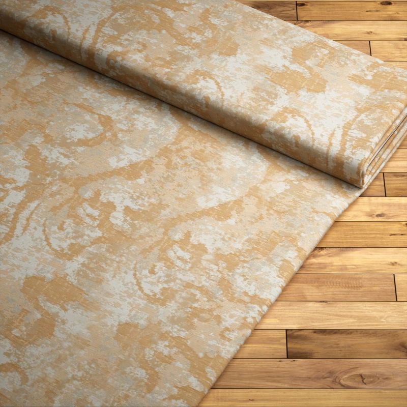 Der helle, schimmernde Stoff mit verschiedenen Orange- und Apricottönen strahlt eine angenehme Milde aus und trägt zu einer fröhlichen, positiven Stimmung bei. Weniger leuchtend, vielmehr sanft kommt die Gestaltung in Orange daher und kann besonders gut mit mildem Weiss, kräftigen Brauntönen, Grau oder Taupe kombiniert werden. Helles Holz und sattes Grün unterstreichen den lebendigen, abwechslungsreichen Look.