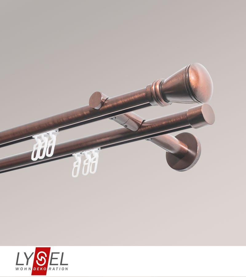 Dieses zweiläufige Gardinenstangen Set aus Metall mit offenen Trägern beinhaltet neben den Innenlaufstangen in glänzender Optik auch die Träger mit Metallmontageplatte und Befestigungsmaterial. Die Klickgleiter inkl. Faltenlegehaken aus Kunststoff tragen zu einem leichtgängigen Auf- und Zuziehen der Gardinen bei und lassen sich an jede beliebige Position setzen. Anschliessend werden sie einfach in die Gardinenstange mit Innenlauf eingeklickt und es ergeben sich vielfältige Gestaltungsmöglichkeiten. Hier haben die Endstücke die Form eines Kegelstumpfs, wirken antik und können auch an einen Türknauf erinnern. Mit dem beiliegenden Innensechskantschlüssel werden sie fixiert; die Kappen dagegen einfach auf die Gardinenstange aufgesteckt. Diese können Sie in verschiedenen Längen bestellen. Abhängig davon sind zusätzlich Verbinder im Lieferumfang enthalten, welche die einzelnen Gardinenstangen zusammenführen und für Stabilität sorgen. Die robusten Träger besitzen jeweils zwei halbrunde Öffnungen und dienen der Schraubmontage an der Wand. Dabei haben Sie die Möglichkeit die Gardinenstangen wahlweise mit der Öffnung nach oben oder unten anzubringen. Sie werden in die Träger eingelegt und anschliessend mit kleinen Schrauben fixiert.