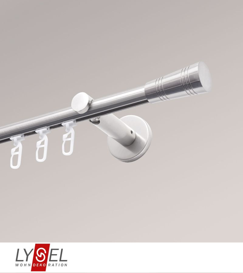 Dieses einläufige Gardinenstangen Set aus Metall mit offenen Trägern und Innenlauf beinhaltet neben der runden Gardinenstange in glänzender Optik auch die Träger mit Metallmontageplatte und Befestigungsmaterial. Die Klickgleiter inkl. Faltenlegehaken aus Kunststoff tragen zu einem leichtgängigen Auf- und Zuziehen der Gardinen bei und lassen sich an jede beliebige Position setzen. Anschliessend werden sie einfach in die Gardinenstange mit Innenlauf eingeklickt und es ergeben sich vielfältige Gestaltungsmöglichkeiten. Hier sind die Endstücke geometrisch und geradlinig, erinnern an einen Kegelstumpf. Zudem sind sie mit rundherum laufenden Einkerbungen verziert, wobei sich jeweils zwei mal drei nebeneinander befinden. Sie werden einfach auf die Gardinenstange aufgesteckt. Diese können Sie in verschiedenen Längen bestellen. Abhängig davon sind zusätzlich Verbinder im Lieferumfang enthalten, welche die einzelnen Gardinenstangen zusammenführen und für Stabilität sorgen. Die robusten Träger besitzen jeweils eine halbrunde Öffnung und dienen der Schraubmontage an der Wand. Dabei haben Sie die Möglichkeit die Gardinenstange wahlweise mit der Öffnung nach oben oder unten anzubringen. Sie wird in die Träger eingelegt und anschliessend mit kleinen Schrauben fixiert.