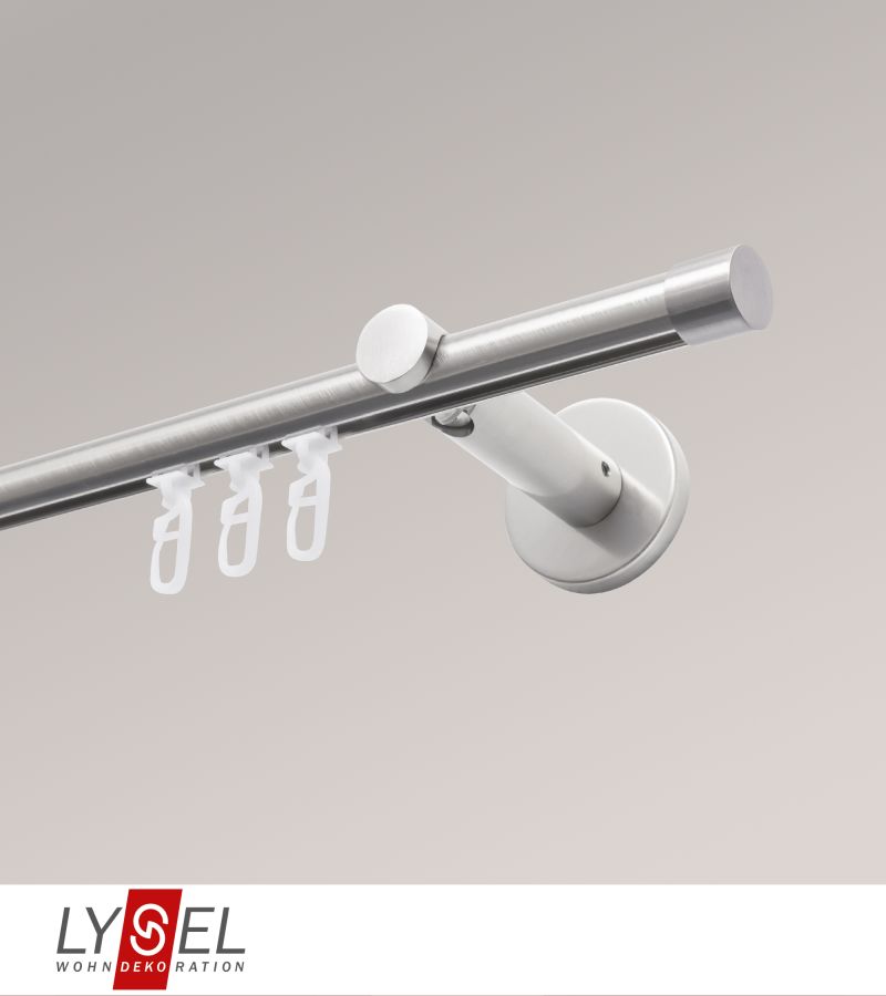 Dieses einläufige Gardinenstangen Set aus Metall mit offenen Trägern und Innenlauf beinhaltet neben der runden Gardinenstange in glänzender Optik auch die Träger mit Metallmontageplatte und Befestigungsmaterial. Die Klickgleiter inkl. Faltenlegehaken aus Kunststoff tragen zu einem leichtgängigen Auf- und Zuziehen der Gardinen bei und lassen sich an jede beliebige Position setzen. Anschliessend werden sie einfach in die Gardinenstange mit Innenlauf eingeklickt und es ergeben sich vielfältige Gestaltungsmöglichkeiten. Hier sind die Endstücke modern und schlicht als Kappen gestaltet, können einfach auf die Gardinenstange aufgesteckt werden. Diese können Sie in verschiedenen Längen bestellen. Abhängig davon sind zusätzlich Verbinder im Lieferumfang enthalten, welche die einzelnen Gardinenstangen zusammenführen und für Stabilität sorgen. Die robusten Träger besitzen jeweils eine halbrunde Öffnung und dienen der Schraubmontage an der Wand. Dabei haben Sie die Möglichkeit die Gardinenstange wahlweise mit der Öffnung nach oben oder unten anzubringen. Sie wird in die Träger eingelegt und anschliessend mit kleinen Schrauben fixiert.