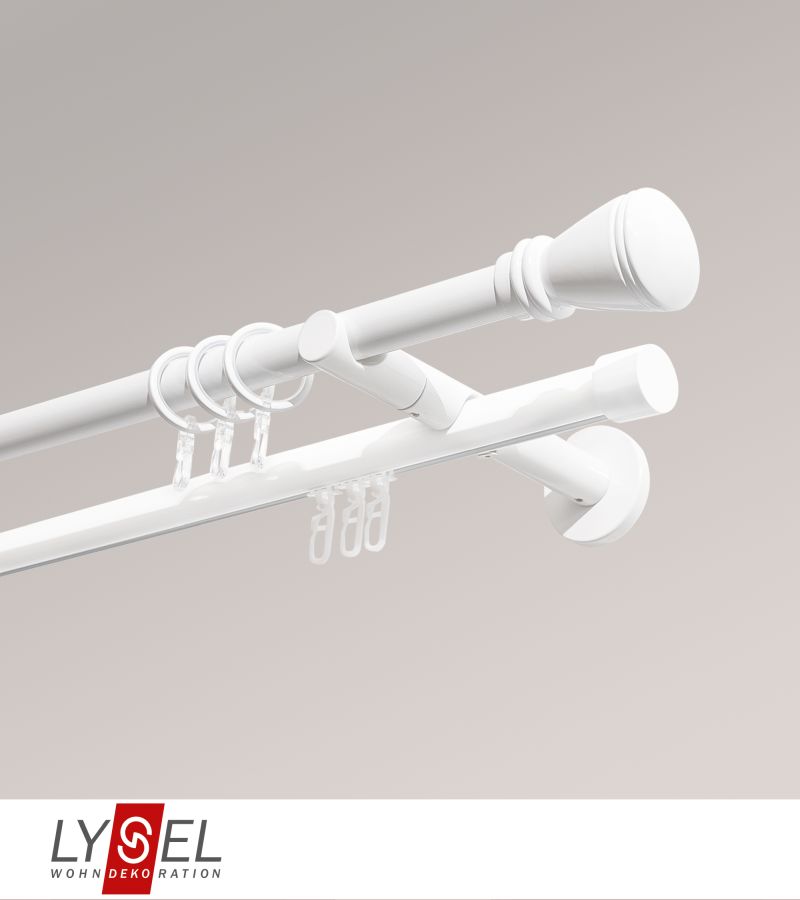 Dieses zweiläufige Gardinenstangen Set aus Metall mit offenen Trägern beinhaltet eine Innenlaufstange und eine klassische, runde Gardinenstange. Ausserdem sind im Lieferumfang die Doppel-Kombiträger mit Metallmontageplatte und Befestigungsmaterial, die Klickgleiter für die Innenlaufstange und die Gardinenringe mit Gleiteinlage und Gardinenhaken für die Gardinenstange enthalten. Bei der Innenlaufstange tragen die Klickgleiter inkl. Faltenlegehaken aus Kunststoff zu einem leichtgängigen Auf- und Zuziehen der Gardinen bei und lassen sich an jede beliebige Position setzen. Fädeln Sie auf die klassische Gardinenstange die Gardinenringe mit Gleiteinlage und Haken auf; anschliessend wird die Gardine oder der Vorhang mittels Gardinenband oder Kräuselband an den Faltenhaken befestigt. Die integrierte Gleiteinlage erleichtert die Bedienung und sorgt zudem für ein nahezu geräuschloses Verschieben der Ringe auf der Stange. Hier haben die Endstücke die Form eines Kegelstumpfs, wirken antik und können auch an einen Türknauf erinnern. Mit dem beiliegenden Innensechskantschlüssel werden sie fixiert; im Gegensatz dazu werden die Kappen einfach auf die hintere Gardinenstange aufgesteckt. Die robusten Doppel-Kombiträger besitzen als Gardinenstangen Halterung jeweils zwei halbrunde Öffnungen und dienen der Schraubmontage an der Wand. Dabei haben Sie die Möglichkeit die Gardinenstangen wahlweise mit der Öffnung nach oben oder unten anzubringen. Sie werden in die Träger eingelegt und anschliessend mit kleinen Schrauben fixiert.
