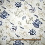Auf dem hellen Hintergrund in Weiss und Schattierungen eines milden Naturtons kommt das maritime Design besonders gut zur Geltung. Die Schriftzüge und Details sind grösstenteils in dunklem Marineblau und Grau gehalten, wobei einige Elemente wie gezeichnet wirken und dem Stoff zusätzlich eine lebendige Aura verleihen. Mit weiteren Blau- und Grautönen, ebenso roten Akzenten lässt sich dieses Modell wunderbar kombinieren.