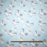 Mit dem fantasievollen Einhorn Design ist dieser Stoff die beste Basis für bunte Kinderzimmer Accessoires. Die Einhörner wirken aufgeweckt und blicken freundlich drein. In gleichmässigen Abständen sind sie versetzt auf dem Stoff drapiert und einander zugewandt. Mit der bunten Mähne und dem bunten Schweif ziehen sie die Aufmerksamkeit auf sich, die Sterne greifen einen Farbton auf und fügen sich so in das Gesamtbild ein. Ebenso sind die Regenbögen eine schöne Ergänzung für das liebevoll und kindlich wirkende Design. Da der Stoff auch in Meterware erhältlich ist, können Sie individuelle Accessoires selbst nähen. Im Konfigurator dagegen stellen Sie sich Fensterdeko & Co. nach Mass zusammen. Bei einem massgefertigten Gardinenschal, der die perfekte Mischung aus Helligkeit und Sichtschutz bietet, können Sie unter anderem die Aufhängung individuell festlegen. Das Polyestergewebe lässt mildes Licht hindurch, neugierige Blicke werden stets abgeschirmt.