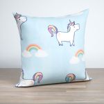 Die Einhörner sind mit Umrissen und Schraffuren in magischem Lila gestaltet. Dieser Ton findet sich neben Lindgrün, Himbeerrot und Orange auch im Schweif und in der Mähne wieder. Der Regenbogen ist in anderen leuchtenden Farben gestaltet, die wunderbar mit dem hellblauen Hintergrund harmonieren.