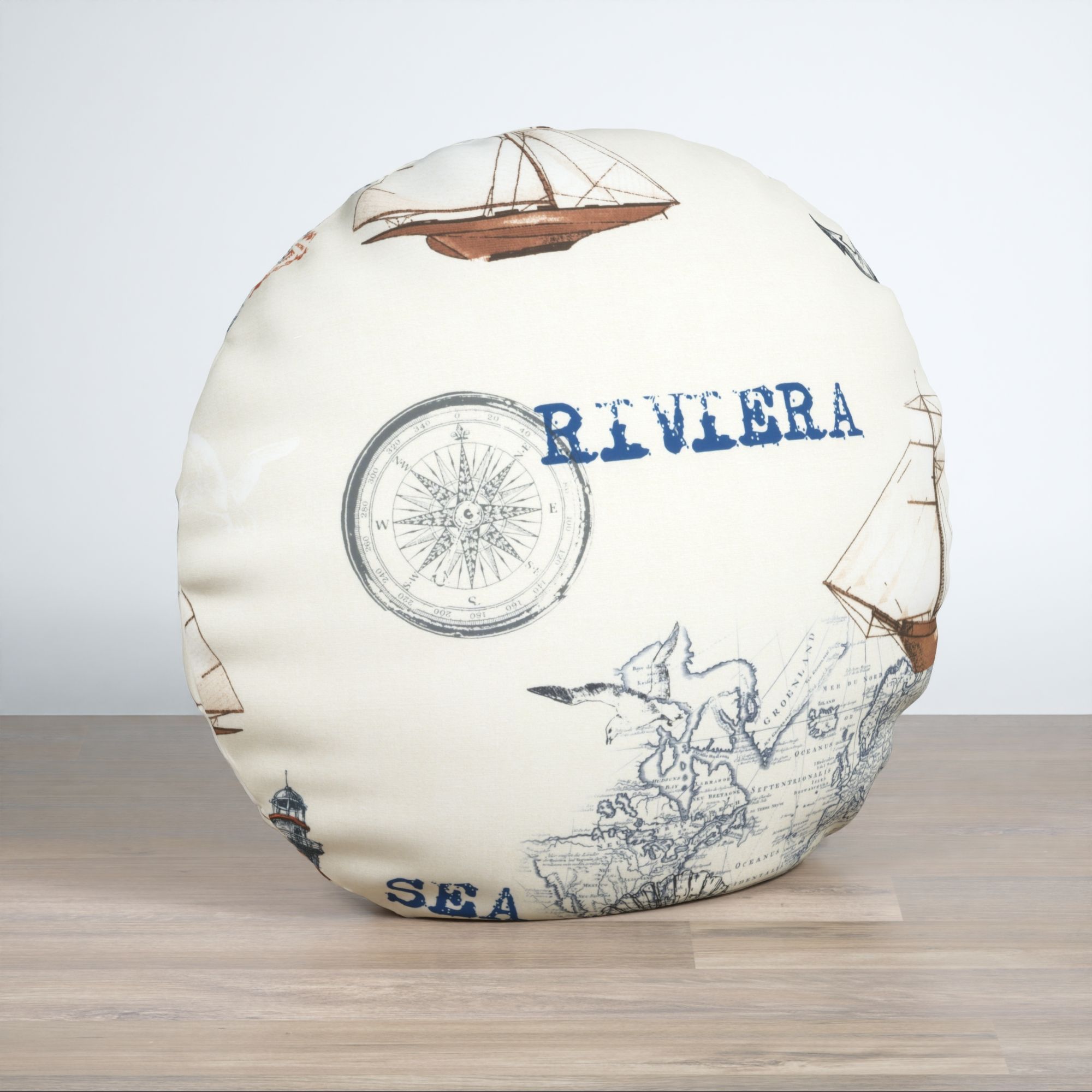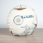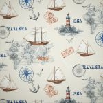 Auf dem Stoff in hellem Creme muss man die maritimen Elemente nicht lange suchen. Durch ihre Gestaltung in dunklen Blautönen, Braun und Rot wecken sie sofort die Aufmerksamkeit des Betrachters und zeigen, wo der Kurs hingehen soll. Weitere Erdtöne und viel Weiss können den Look harmonisch ergänzen.
