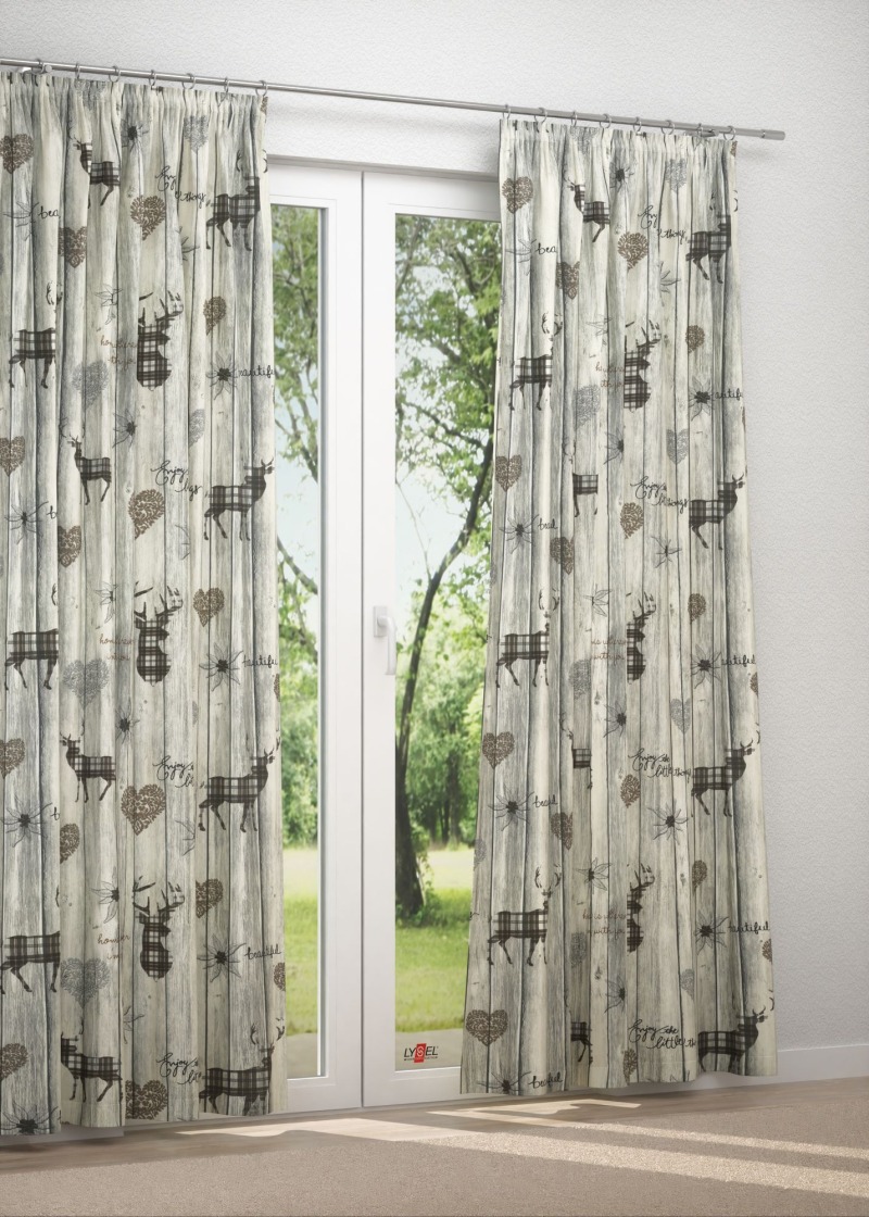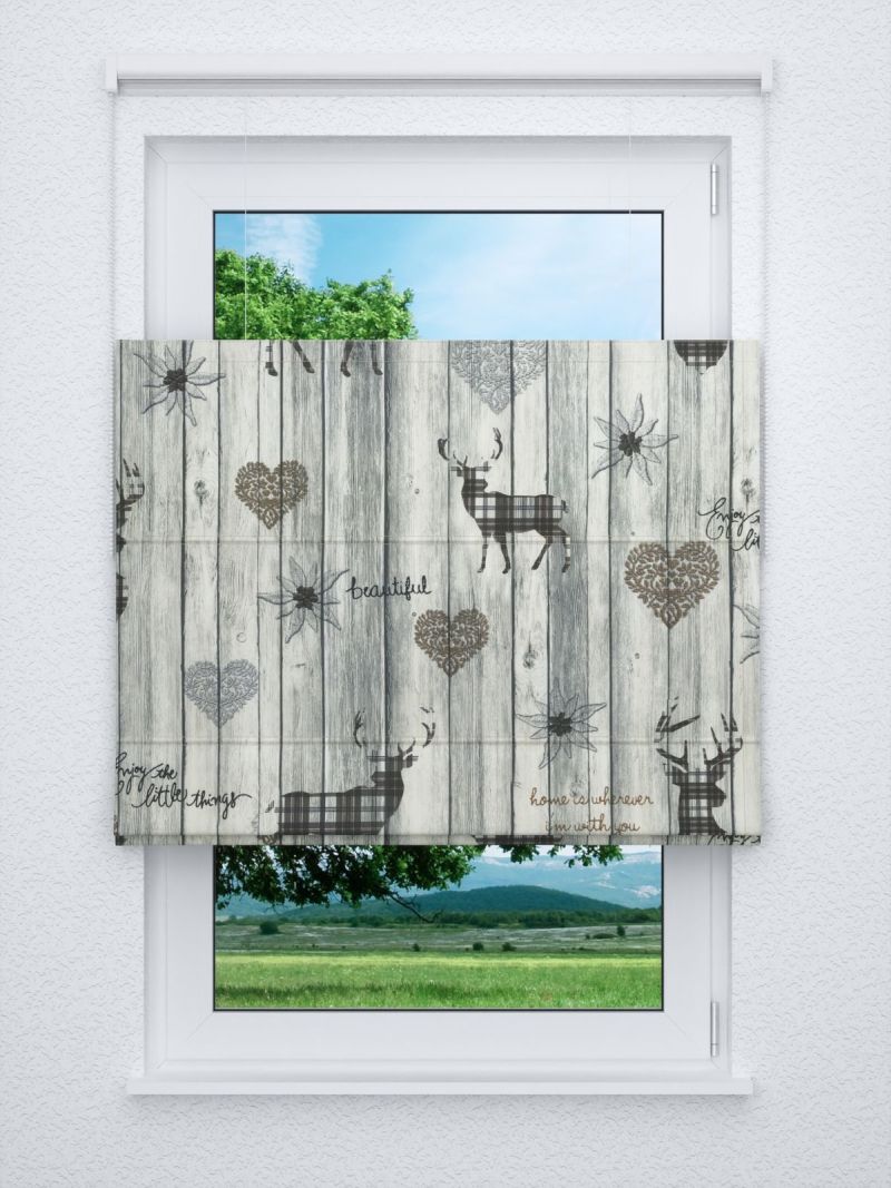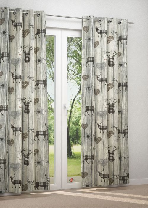 Durch die naturgetreue Maserung strahlen die Holzbretter Lebendigkeit und Gemütlichkeit aus. Detailverliebt und rustikal sind sie der ideale Hintergrund für die verschiedensten Symbole, die sich in die heimelige Umgebung wunderbar einbetten. Ergänzt werden die Blumen und Herzen durch imposante, mit Karomuster gestaltete Hirsche, die sich durch das ausdrucksstarke Design und die etwas andere Farbgebung von dem Stoff abheben. Das per Digitaldruck auf die Vorderseite aufgedruckte Motiv lässt dieses Modell zur Basis vieler Accessoires werden, die Sie im Konfigurator nach Mass zusammenstellen oder aus der Meterware selbst nähen können. Entscheiden Sie sich zum Beispiel für einen Gardinenschal nach Mass, bietet Ihnen dieser die perfekte Mischung aus Helligkeit und Sichtschutz. Es gelangt weiterhin mildes Licht in den Raum, wodurch dieser offen und einladend wirkt. Neugierige Blicke kommen weder tagsüber noch abends durch den Stoff hindurch.